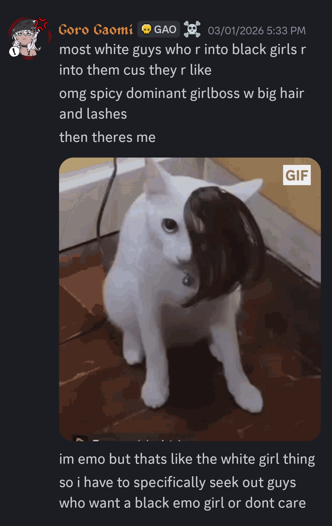 Goro is sad because white boys don't like her