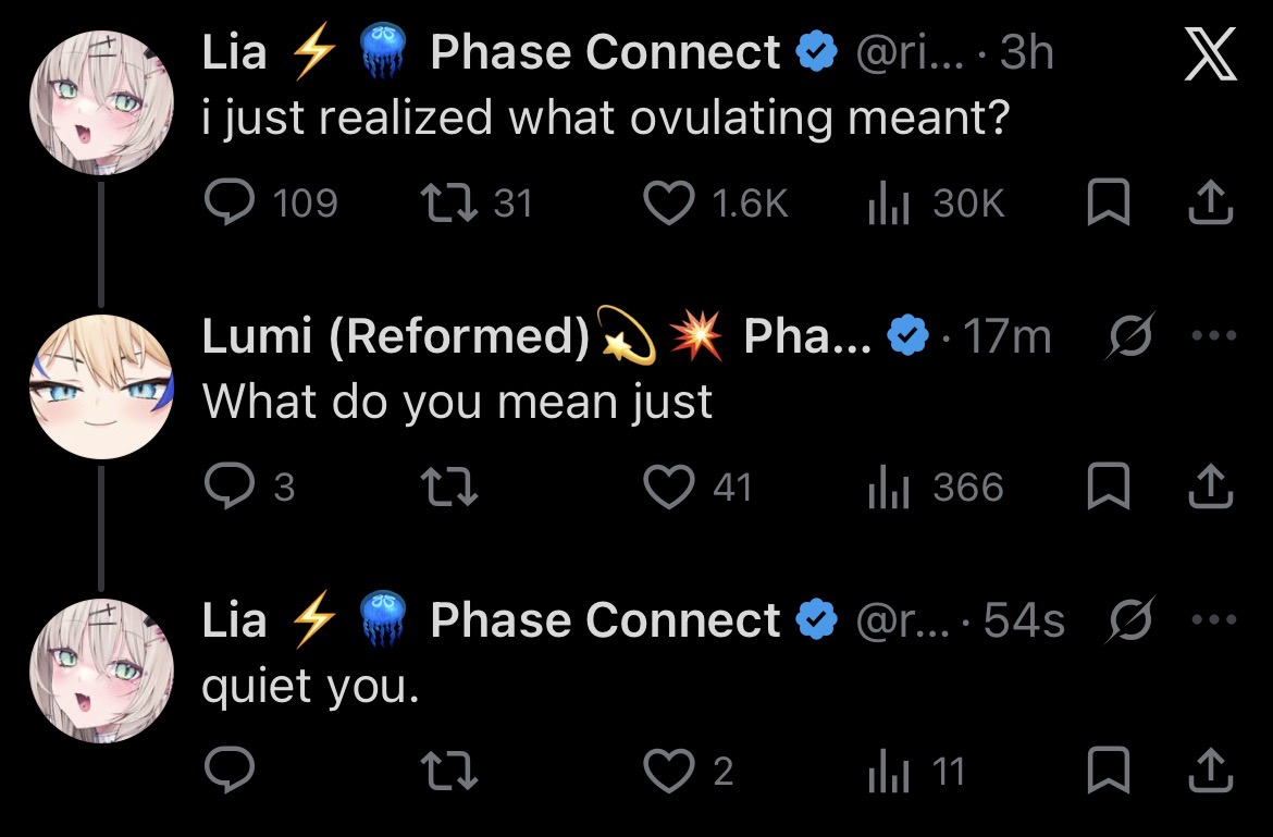 ▼ Phase Connect LinksOfficial Website: https://phase-connect.comOfficial Schedule: https://schedule.phase-connect.comOfficial Twitter: https://x.com/PhaseConnect | https://x.com/PhaseConnectJPOfficial Character References: https://rentry.org/pcgreferencesOfficial Twitch Archive Channels: https://rentry.org/pcgtwitcharchiveUnofficial Phase Connect Archives: https://rentry.org/pcgunofficialarchive––––––––––––––––––––––––––––––––––◆【Lia】https://x.com/rinkouashelia | https://youtube.com/RinkouAshelia | https://twitch.tv/asheliarinkou◆【Utatane Nasa】転寝ナサ (JP) https://x.com/UtataneNasa | https://youtube.com/UtataneNasa | https://twitch.tv/utatanenasa◆【Hakushika Iori】白鹿いおり (JP + EN) https://x.com/hakushikaiori | https://youtube.com/HakushikaIori | https://twitch.tv/iorihakushika◆【Fujikura Uruka】https://x.com/fujikurauruka | https://youtube.com/FujikuraUruka | https://twitch.tv/fujikurauruka◆【Shisui Michiru】紫翠みちる (JP) https://x.com/shisuimichiru | https://youtube.com/ShisuiMichiru | https://twitch.tv/michiru_shisui◆【Tenma Maemi】https://x.com/tenmamaemi | https://youtube.com/TenmaMaemi | https://twitch.tv/tenma◆【Pipkin Pippa】https://x.com/pipkinpippa | https://youtube.com/PipkinPippa | https://twitch.tv/pippa––––––––––––––––––––––––––––––––––◆【Kaneko Lumi】https://x.com/kaneko_lumi | https://youtube.com/KanekoLumi | https://twitch.tv/kanekolumi◆【Fuura Yuri】[Terminated] https://x.com/AmarisYuri | Archive: https://youtube.com/@TheNationalFuuraYuriArchive◆【Dizzy Dokuro】https://x.com/dizzydokuro | https://youtube.com/@dizzydokuro | https://twitch.tv/dizzydokuro◆【Jelly Hoshiumi】https://x.com/jellyhoshiumi | https://youtube.com/@jellyhoshiumi | https://twitch.tv/jellyhoshiumi◆【Ember Amane】https://x.com/emberamane | https://youtube.com/@EmberAmane | https://twitch.tv/emberamane◆【Clio Aite】https://x.com/ClioAite | https://youtube.com/@ClioAite | https://twitch.tv/clioaite◆【MariMari_en】https://x.com/MARIMARI_EN | https://youtube.com/@MARIMARI_EN | https://twitch.tv/marimari_en◆【Eepy Sleepy】https://x.com/EepySleepyCh | https://youtube.com/@EepySleepyCh | https://twitch.tv/EepySleepy––––––––––––––––––––––––––––––––––◆【Remilia Nephys】https://x.com/Remilia_Nephys | https://youtube.com/RemiliaNephys | https://twitch.tv/remilianephys◆【Chisaka Airi】https://x.com/ChisakaAiri | https://youtube.com/ChisakaAiri | https://twitch.tv/chisakaairi◆【Amanogawa Shiina】https://x.com/AmanogawaShiina | https://youtube.com/AmanogawaShiina | https://twitch.tv/amanogawashiina◆【Himemiya Rie】https://x.com/HimemiyaRie | https://youtube.com/HimemiyaRie | https://twitch.tv/himemiyarie◆【Erina Makina】https://x.com/ErinaMakina | https://youtube.com/ErinaMakina | https://twitch.tv/erinamakina◆【Komachi Panko】https://x.com/komachipanko | https://youtube.com/KomachiPanko | https://twitch.tv/komachipanko––––––––––––––––––––––––––––––––––◆【Runie Ruse】https://x.com/RunieRuse | https://youtube.com/@RunieRuse | https://twitch.tv/RunieRuse◆【Eimi Isami】https://x.com/eimiisami | https://youtube.com/@eimiisami | https://twitch.tv/eimiisami◆【Muu Muyu】https://x.com/Muu_Muyu | https://youtube.com/@MuuMuyu | https://twitch.tv/MuuMuyu◆【Hikanari Hina】https://x.com/HikanariHina | https://youtube.com/@HikanariHina | https://twitch.tv/HikanariHina◆【Saya Sairroxs】[Phase Citizen] https://x.com/sayasairroxs | https://youtube.com/@sayasairroxs | https://twitch.tv/sayasairroxs––––––––––––––––––––––––––––––––––◆【Kannagi Loki】巫ロキ (JP) https://x.com/kannagiloki | https://youtube.com/@kannagiloki ◆【Kokoromo Memory】[Phase Citizen] https://x.com/kokoromomemory | https://youtube.com/@kokoromomemory_ | https://twitch.tv/kokoromomemory◆【Gram Pico】倉夢ぴこ (JP) https://x.com/grampico_ | https://youtube.com/@grampico | https://twitch.tv/grampico◆【Ayase Yuu】絢世ユウ (JP) https://x.com/ayaseyuuu | https://youtube.com/@ayaseyuu | https://twitch.tv/ayaseyuu_◆【Kaminari Clara】[Graduated] https://x.com/kaminariclara_ | https://youtube.com/@kaminariclara | https://twitch.tv/kaminariclara––––––––––––––––––––––––––––––––––◆【Malice Evermore】https://x.com/MaliceEvermore | https://youtube.com/@maliceevermore | https://twitch.tv/maliceevermore◆【Nitya Nil】https://x.com/Nitya_Nil | https://youtube.com/@Nitya_Nil | https://twitch.tv/nitya_nil◆【Wilhelmina Frost】https://x.com/wilhelminafr0st | https://youtube.com/@wilhelminafrost | https://twitch.tv/wilhelminafrost◆【Bibi Biscuit】https://x.com/BibiBiscuitCh | https://youtube.com/@bibibiscuitch | https://twitch.tv/bibibiscuitch◆【Anya Nyabyss】https://x.com/AnyaNyabyss | https://youtube.com/@AnyaNyabyss | https://twitch.tv/anyanyabyss◆【Sinon Sinfonia】https://x.com/SinonSinfonia | https://youtube.com/@SinonSinfonia | https://twitch.tv/sinonsinfoniaPrevious Thread: >>110332686