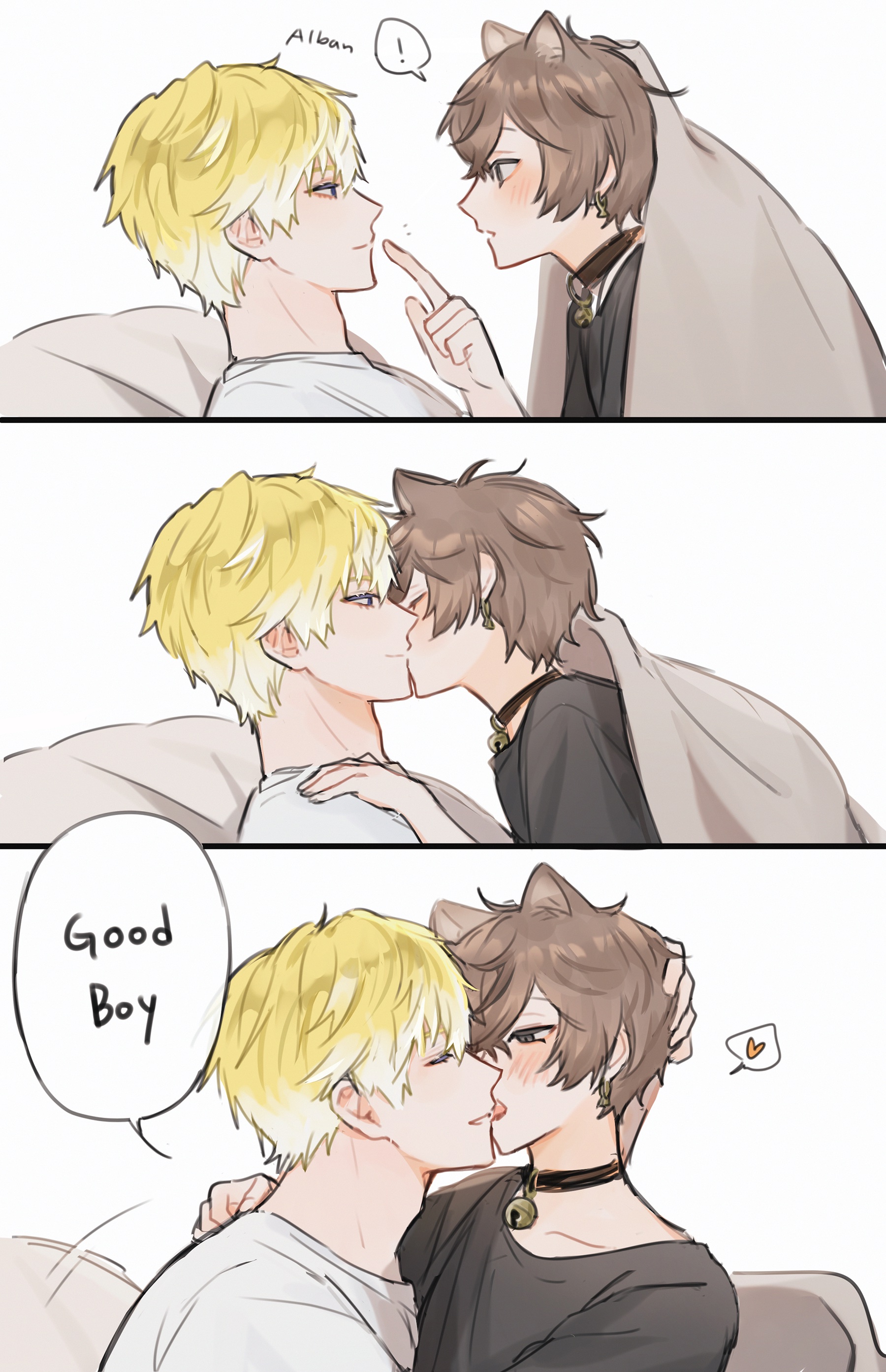 After a few seconds Altare is oddly still. No longer crying, just staring silently. Even with eyes closed you can feel the atmosphere is so hot and heavy now. An odd pull gets you to kiss more and more up his arm. You and him are talking not through words but through thumping heartbeats, physical contact and closeness, and a magnetic tension that makes you both feel just right with each other. That’s why you don’t know who kissed who on the lips first. Or who was the first to hold hands. You don’t know when you helped Altare off his shirt or when you got on his bed covering your bra with your hands, nor when Altare got on top of you.