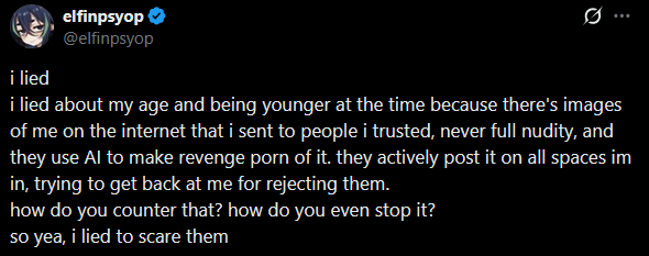>>110480333that's not how it ended. I think she got scared that she could actually get in trouble for that so she came back and denied it all and said she was lying about being underage to make people stop sharing her nudes. There were a few more posts until eventually she deleted all her social media and disappeared.