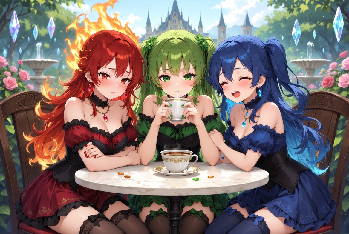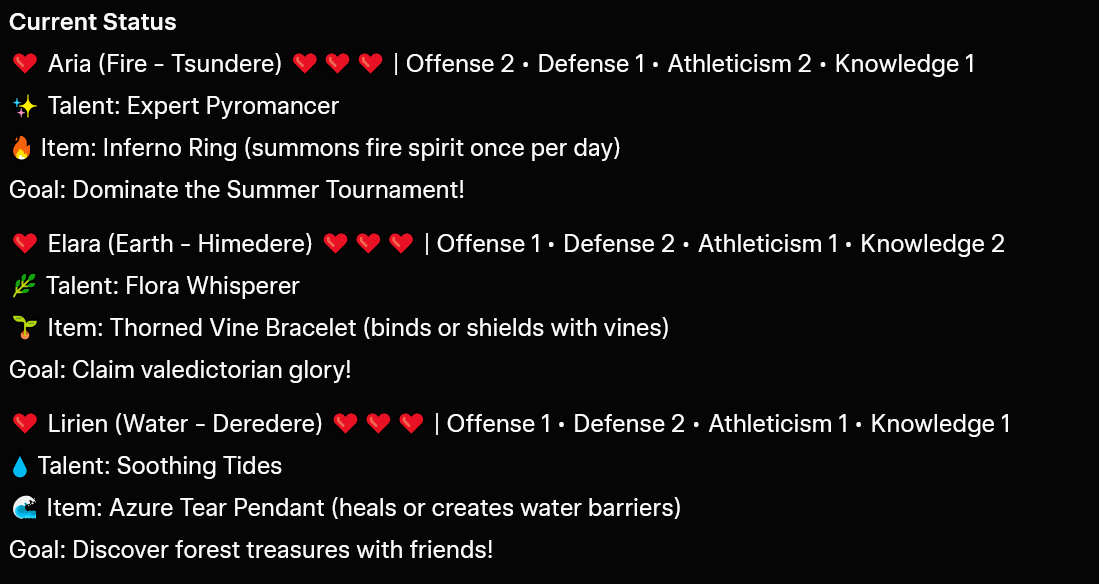 They're planning their first adventure into the forest. I guess the green one became the leader. Lirien improved her athletics by swimming, Aria improved her offensive magic by committing murder, and Elara improved her knowledge by researching the forest in the library. Saba should play some RPGs or visual novels.