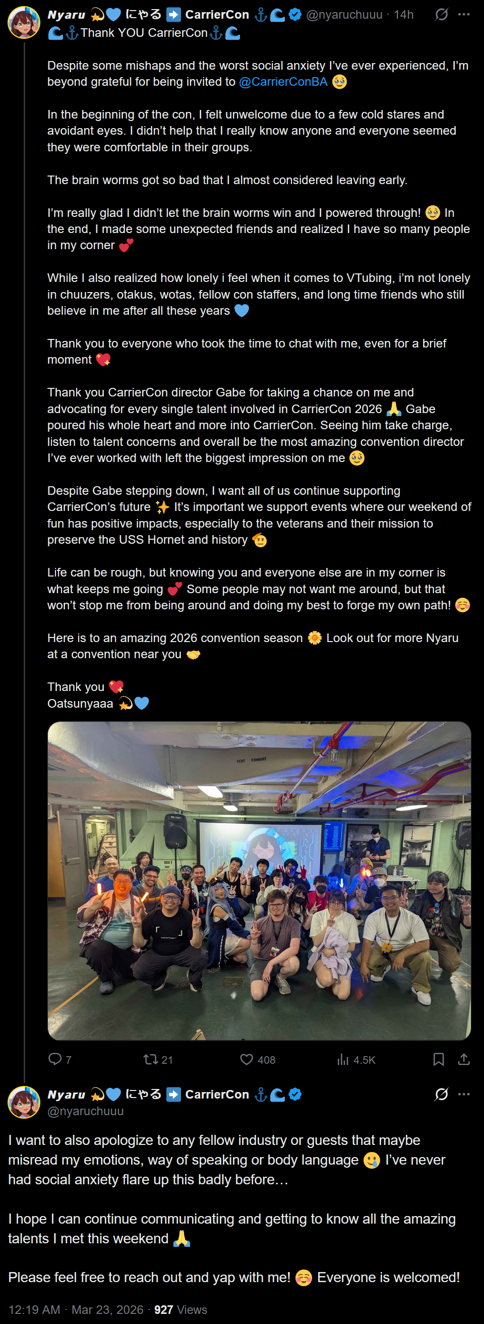 Nyaru put out a statement on her experience at Carrier Con