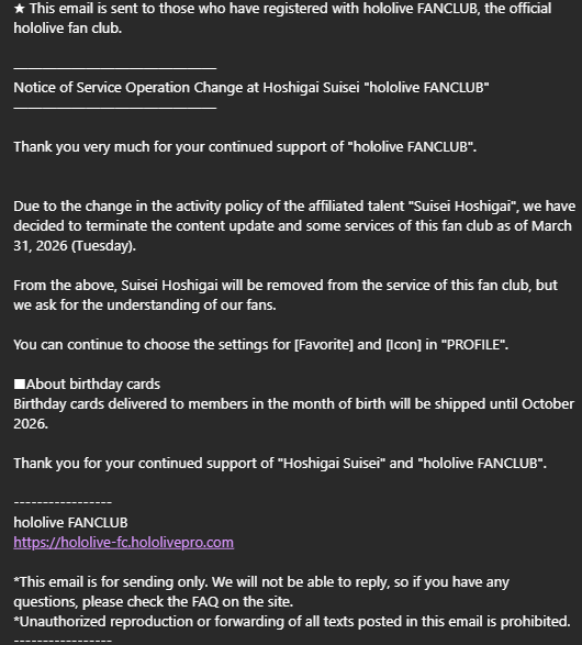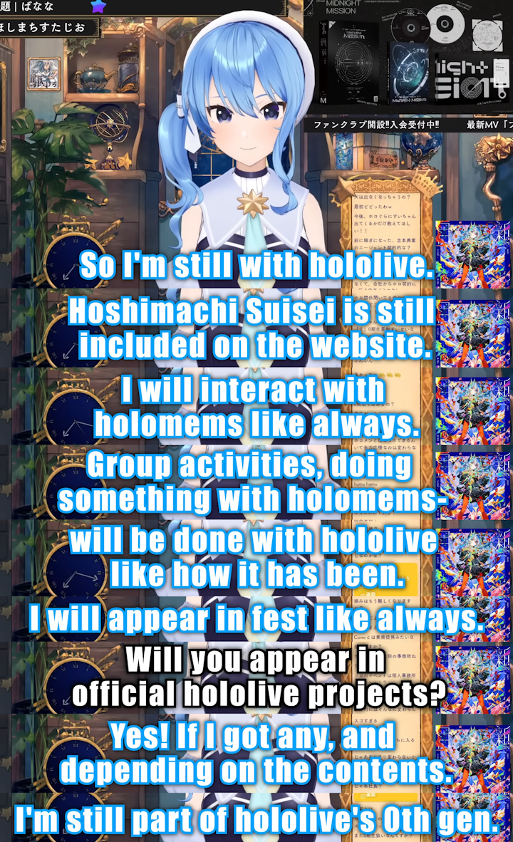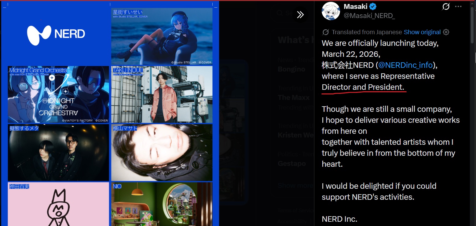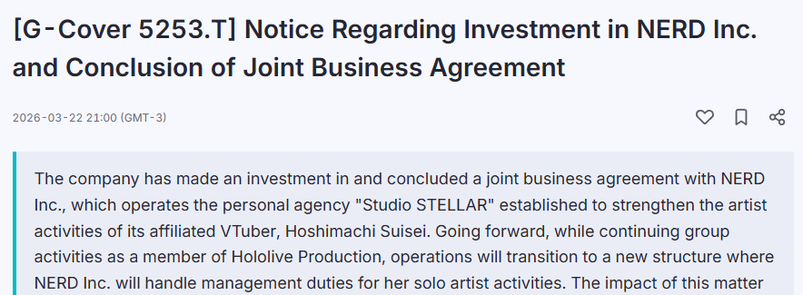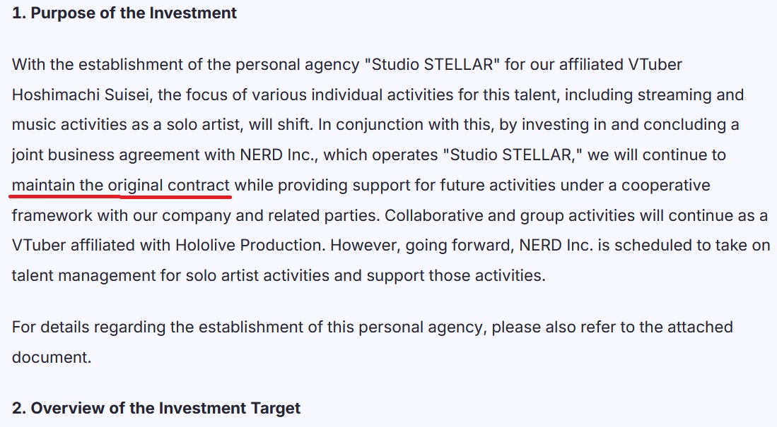 >>110499512I'll say again, please just watch streams for once in your lifeshe literally also addresses still being part of hololive in her very own stream, literally look at any press release or legal document and notice how it still says ホロライブプロダクションに所属するVTuberとして when they refer to 星街すいせい look at cover's own financial disclosures they're legally bound to make and see how they themselves have a stake in both SS and Nerd: https://finance.biggo.com/news/jpx_tdnet_140120260323586039consider how literally EVERY Holo is "the one in charge of your own activities" and is literally how their relationships as contractual talents work with regard to Cover