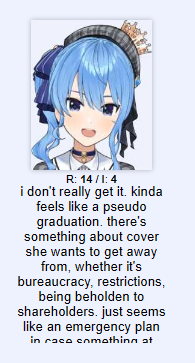 >>110501517Their conclusion is reasonable, in my opinion. They could have created an entire team for Suisei under Cover’s umbrella, but that would have complicated how they allocate resources across talents.With this approach, they’re basically saying: you can have your own setup, but you need to take responsibility and find your own investors. If it’s good enough, we will invest in you.
