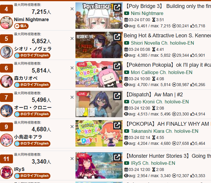 *GENERAL NUMBERFAG SITES*>https://playboard.co/en/>http://ikioi-ranking.com/>https://vrabi.net/>https://vtubertracker.info/en>https://live-ranking.userlocal.jp/vtuber-rankingHololive sites>https://www.hololyzer.net/youtube/index.html>https://trackholo.live/en/>https://holo-spotify-stats.jirikunes.eu/>https://holo-tracker.vercel.app/>https://www.holostats.com/Twitch>https://sullygnome.com/>https://twitchtracker.com/>https://stats.roki.sh/>https://streamscharts.com/
