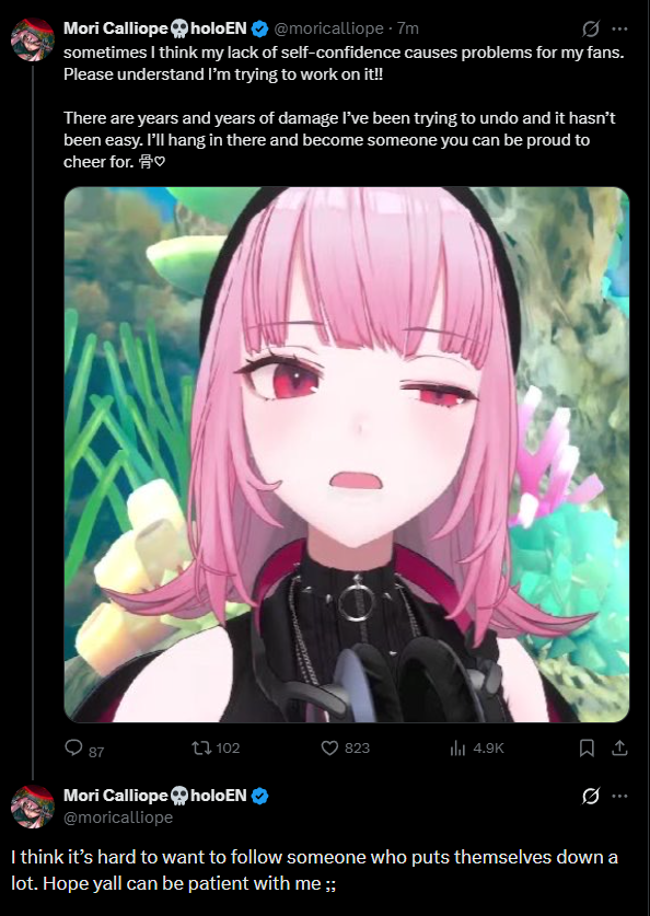 >>110502596>who openly glazes her and reminds her of her achievements like GigiThe thing is, Susiei very actively and openly glazes Mori to the extent of calling Mori her oshiSo Mori is being a schizo here in this context
