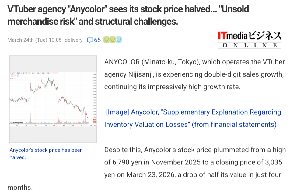 >>110499482>>110499548Speaking of stocks, you guys told me stocks were falling globally but US stocks pumped hard today, so what's the real reason both Anycolor and Cover stock fell today?