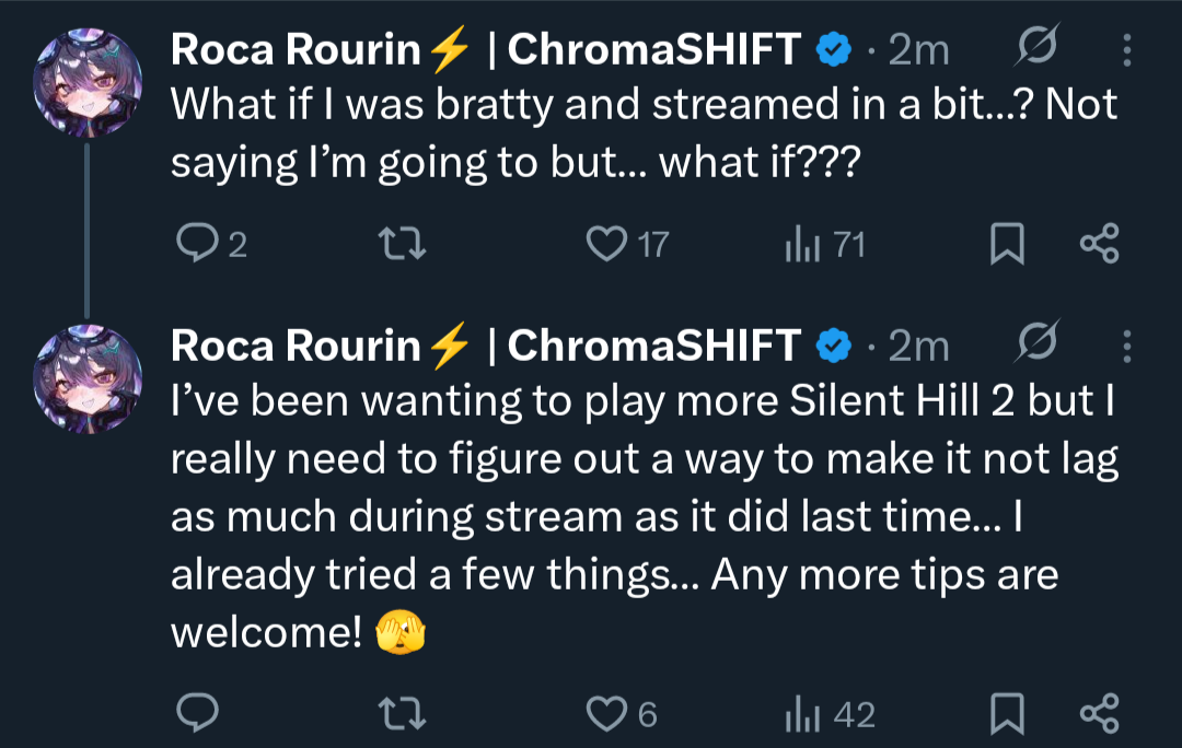 【 Website 】 https://chroma-shift.com/【 YouTube 】 https://www.youtube.com/@ChromaSHIFT_BG【 Twitter 】 https://x.com/ChromaSHIFT_FTW【 Schedules 】 https://holodex.net/?org=ChromaSHIFT / https://pomu.pages.dev/jidf【 Merch 】 https://shop.bravegroup-us.com/pages/projects/chromashift=-=-=-=-=-=-=-=-=-=-=-=-=-=-=-=-=-=-=-=-=-=-=-=-=-=【 Roca Rourin 】[YouTube] https://www.youtube.com/@RourinRoca / [Twitter] https://x.com/RocaRourin / [Twitch] https://www.twitch.tv/RocaRourin【 Poko Rakun 】[YouTube] https://www.youtube.com/@RakunPoko / [Twitter] https://x.com/PokoRakun / [Twitch] https://www.twitch.tv/PokoRakun【 Mia Melonya 】[YouTube] https://www.youtube.com/@MiaMelonya / [Twitter] https://x.com/MiaMelonya / [Twitch] https://www.twitch.tv/MiaMelonya【 Koa Akugaki 】[YouTube] https://www.youtube.com/@AkugakiKoa / [Twitter] https://x.com/AkugakiKoa / [Twitch] https://www.twitch.tv/AkugakiKoa【 Ruby Runeheart 】[YouTube] https://www.youtube.com/@RubyRuneheart / [Twitter] https://x.com/RubyRuneheart / [Twitch] https://www.twitch.tv/RubyRuneheart【 Lalabell Lullaby 】[YouTube] https://www.youtube.com/@LalabellLullaby / [Twitter] https://x.com/LalabellLullaby / [Twitch] https://www.twitch.tv/LalabellLullaby【 Taiga Toragami 】[YouTube] https://www.youtube.com/@TaigaToragami / [Twitter] https://x.com/TaigaToragami / [Twitch] https://www.twitch.tv/TaigaToragami【 Enya Ignis 】[YouTube] https://www.youtube.com/@EnyaIgnis / [Twitter] https://x.com/EnyaIgnis / [Twitch] https://www.twitch.tv/EnyaIgnis【 Shabel Tonya 】[YouTube] https://www.youtube.com/@ShabelTonya / [Twitter] https://x.com/ShabelTonya / [Twitch] https://www.twitch.tv/ShabelTonya【 Daisy Dandelion 】[YouTube] https://www.youtube.com/@DaisyDaLion / [Twitter] https://x.com/DaisyDaLion / [Twitch] https://www.twitch.tv/DaisyDaLion【 Cersea Soulstorm 】[YouTube] https://www.youtube.com/@CerseaSoulstorm / [Twitter] https://x.com/CerseaSoulstorm / [Twitch] https://www.twitch.tv/CerseaSoulstorm【 Riki Poppet 】[YouTube] https://www.youtube.com/@RikiPoppet / [Twitter] https://x.com/RikiPoppet / [Twitch] https://www.twitch.tv/RikiPoppetVT【 Yena Youngblood 】[YouTube] https://www.youtube.com/@YenaYoungblood / [Twitter] https://x.com/YenaYoungblood / [Twitch] https://www.twitch.tv/YenaYoungblood=-=-=-=-=-=-=-=-=-=-=-=-=-=-=-=-=-=-=-=-=-=-=-=-=-=【 Friends 】V&U >>>/vt//vnug/V4Mirai >>>/vt//v4m/PixelLink >>>/vt//pxl/Phase Connect >>>/vt//pcg/EIEN Extended >>>/vt//eiex/=-=-=-=-=-=-=-=-=-=-=-=-=-=-=-=-=-=-=-=-=-=-=-=-=-=Previous Thread: >>110486195