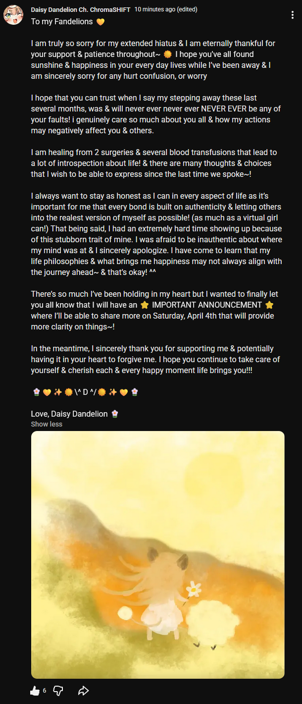 >>110545048>April 4thAt least we have a date now. Good news for fandelions, no matter what Daisy decides to do from now on.