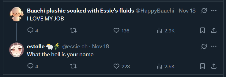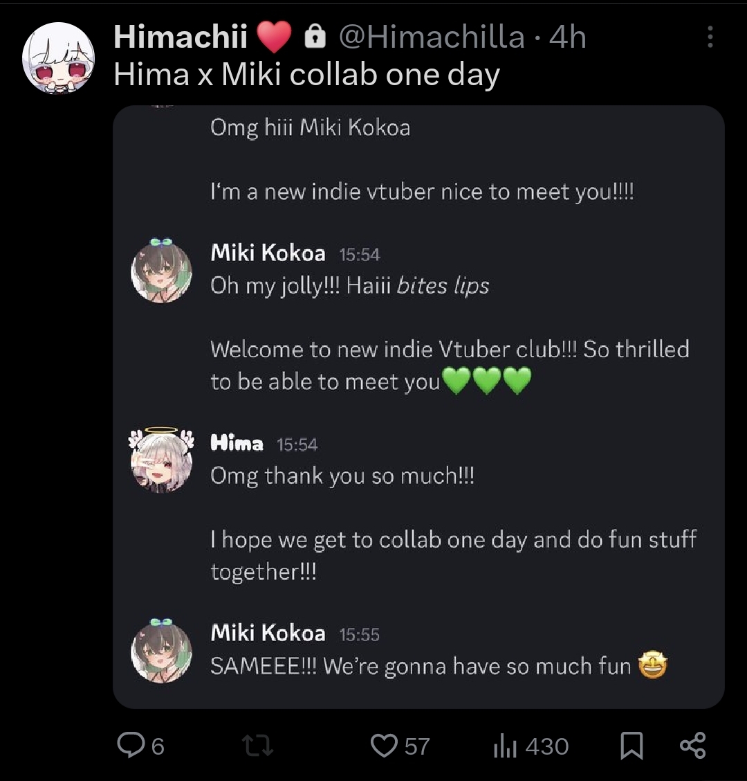 >>110534186Don't be stupid. She got the other person involved to be an intermediary because it's impossible for them to actually communicate, but she couldn't just say that to Hima, that's why she came up with the lie she had to talk to this person to sort out the model situation, but Hima panicked, left the chat, and decided to vaguepost on Xitter and go live on Twitch to talk about the situation.Now, props to her for being fairly professional and not shit talking Ruru on stream, but in the end, I feel like Ruru was more honest because she actually explained the whole situation, admitted her mistake and explained Hima's.Ruru felt bad before, yes, because Hima was talking to people who hated Ruru and wanted to see her fail, but they were supposed to be friends, so it feels like a backstab.Even if you say Ruru is objectively a bad person, that's not something you do to a friend... And even then, Ruru was okay with Hima talking shit about her or doing whatever she wants, but only on her PL.She gave Hima a platform, assets, help, and everything to become a vtuber, only for Hima to betray her by talking to her enemies after a simple woman moment (caused by both.)