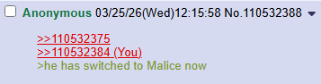 >>110532375>>110532384>he has switched to Malice now