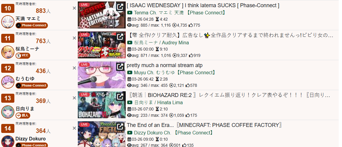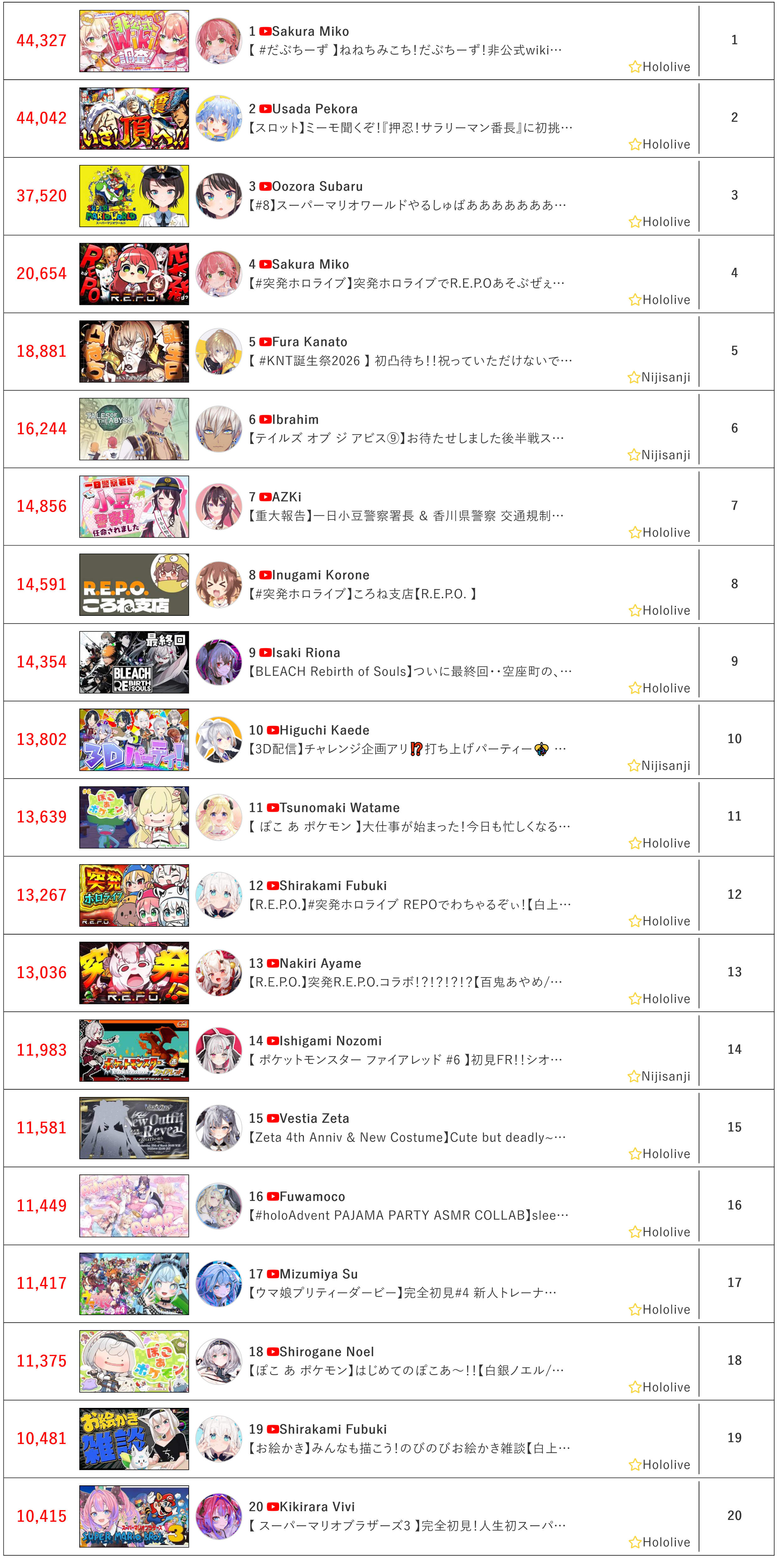 >>110544526>44,327: Miko (Hololive)>44,042: Pekora (Hololive)Slipkora