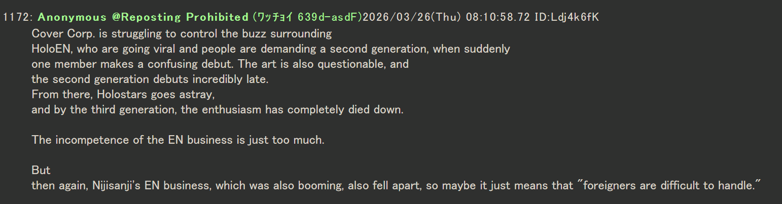 >>110546753Yes in the beginning EN had no support from management because Holo was small and the JP girls were getting jealous of EN's rapid success so Cover stopped helping the EN branch to focus soley on growing the JP branch. And to this day EN is relegated to a 2nd or 3rd priority except for Mori who of course gets preferential treatment from Cover.