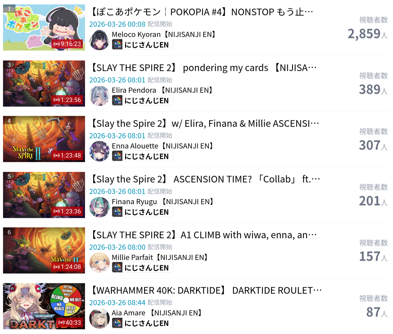 >>110536588MAR 2026 EN SILVER3/1 - Nimi - Resident Evil Requiem: 8,2533/2 - Bijou - FNAF 2: 11,8093/3 - Raora - Return Zatsu: 8,7823/4 - Calliope - Resident Evil Requiem: 8,1023/5 - Nerissa - Announcement Collab: 10,0193/6 - Nimi - Resident Evil Requiem: 5,4913/7 - Only one talent qualified for the tally this day.3/8 - No talent qualified for the tally this day.3/9 - Nimi - Elden Ring Nightreign: 5,1453/10 - Nimi - Resident Evil Requiem: 6,2553/11 - Hololive English - Takotori Dance Lesson: 5,6583/12 - IRyS - Mario Tennis Fever: 11,0253/13 - Bijou - Future Games Show Watchalong: 10,0423/14 - Nimi - Clubhouse 51: 7,4803/15 - Bijou - Resident Evil Requiem: 9,9843/16 - Nimi - Unrailed: 5,5003/17 - Bijou - Arknights Endfield: 7,6083/18 - Shiori - Resident Evil Requiem: 6,4423/19 - Kronii - 3D Live After Talk: 9,1233/20 - Bijou - Pokemon Pokopia: 11,9953/21 - FUWAMOCO - Kanji Learning: 11,2443/22 - Elizabeth - Unarchived Karaoke: 11,2253/23 - IRyS - 3D Live After Talk: 6,7703/24 - Kiara - HoloEN Rewind: 8,5513/25 - Ina'nis - Pokemon Pokopia: 7,382PER COMPANY17x: Hololive English6x: Indie2x: N/APER STREAMER6x: Nimi5x: Bijou2x: IRyS1x: Raora, [Kiara, Calliope, Ina'nis], [Shiori, Nerissa], Kronii, Hololive English, FUWAMOCO, Elizabeth