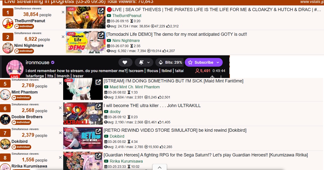 >>110536664MAR 2026 EN BRONZE3/1 - IRyS - Black Mesa: 6,8623/2 - Calliope - Resident Evil Requiem: 9,6713/3 - Nimi - Resident Evil Requiem: 6,7693/4 - Only two talents qualified for the tally this day.3/5 - Raora - Pokemon Pokopia: 8,6923/6 - Only two talents qualified for the tally this day.3/7 - Only one talent qualified for the tally this day.3/8 - No talent qualified for the tally this day.3/9 - Only two talents qualified for the tally this day.3/10 - Calliope - Zatsu: 5,0553/11 - Gigi - Zatsu: 5,0283/12 - Bijou - Pokemon Pokopia: 9,3503/13 - Gigi - Future Games Show Watchalong: 8,9233/14 - Kiara - Arknights Enfield: 6,2723/15 - IRyS - Mario Tennis Fever: 9,7093/16 - Only two talents qualified for the tally this day.3/17 - Shiori - Resident Evil Requiem: 6,6693/18 - Mint - Karaoke plus Announcement: 6,2453/19 - Calliope - Karaoke plus Announcement: 8,6093/20 - IRyS - Resident Evil Requiem: 8,9603/21 - Kiara - Slay the Spire 2: 7,4133/22 - Nimi - Brush up plus karaoke: 9,4703/23 - Baelz - Yakuza 6: 5,0763/24 - Nimi - Poly Bridge 3: 7,2153/25 - Baelz - Archived Karaoke: 6,713PER COMPANY15x: Hololive English6x: N/A3x: Indie1x: Densetsu.EXEPER STREAMER3x: IRyS, Calliope, Nimi2x: Kiara, Gigi1x: Raora, Baelz, [Bijou, Shiori]