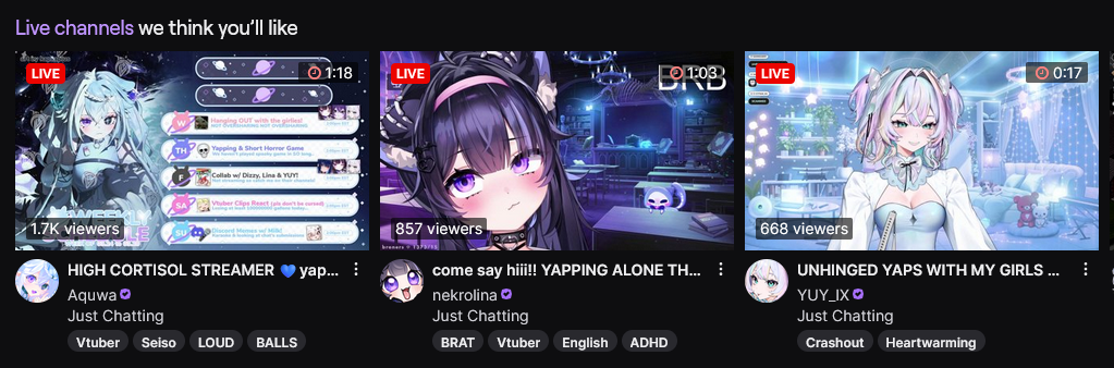 Brainrot Edition>What is /lig/?/lig/ is a thread for viewers to find, share, and discuss indie vtubers who have on average 500 viewers or more.>Why /lig/?Large indie vtubers have more net fans, but they are outnumbered by 2views by the thousands. This is a thread for the VIP, regardless of what language they stream on.>Can I shill my 499view oshi here?Considering averages fluctuate widely, all the way down to 100 is reasonable. The minimal requirement however is being Twitch partner or the YouTube equivalent in numbers.>Wait isn't that one a corpo?/lig/ is a thread for chuubas of a decent size who aren't defined by their corporate branding, either due to the small size of the corporation or the independence and lack of oversight granted to the talents>/lig/ Numbershttps://lignumbers.neocities.org/>Twitch Clips Guidehttps://pastelink.net/34vd5>VOD Archival Guidehttps://rentry.org/Vod_Archival_Guide>/lig/ VOD Archivehttps://rentry.org/Indie_Vod_Archives_lig_>Koikatsu cardshttps://mega.nz/folder/JYtkXJwL#07gAQCQqI_9FsmX9oQJKSA>/lig/ Wheel of Nameshttps://wheelofnames.com/5jh-93j>Tiermakerhttps://tiermaker.com/create/-lig--16586688-3>/lig/ Chuuba Birthday Calendar (WIP)https://www.canva.com/design/DAE-XgWodVg/ofLz4QC1yPPQ4T6TTAE0fw/edit?utm_content=DAE-XgWodVg>Upcoming BirthdaysMarch 25th - Rokoko PrufeiMarch 26th - Michi MochieveeMarch 28th - CyphiMarch 31st - Nina SaotomeApril 2nd - Honey GoblinApril 11th - Ume AinoApril 18th - SarueiApril 19th - Yoclesh & ZumaApril 23rd - Coqui & Limealicious & MomotexxApril 24th - Sugi AokiApril 27th - Peach Milky>OC material for the OPhttps://mega.nz/folder/IIVD1IaJ#cfsRhWdJvzneIoG8HZUPuw>/lig/booruhttps://ligbooru.moe/>Duckshttps://www.twitch.tv/dashducks (embed) (embed) (embed) (embed)Other useful threads:>>>/vt//big/>>>/vt//corpo/>>>/vt//choc/>>>/vt//flip/>>>/vt//haha/>>>/vt//indie/>>>/vt//mint/>>>/vt//swarm/>>>/vt//vrt/>>>/vt//xvsj+/Previous Thread: >>110535527