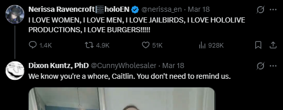 And this fella >>110576222 using AI to make a revenge fuck porn. To put on perspective of how deranged those unicucks are, the nijisister makes me want to gag and vomit with how pretentious she was against IRyS of all people, but that unicuck is actually malicious with an intent to harm Nerissa herself. The sister probably would just kill herself if you push her but the unicuck would unironically kill others if you do the same.