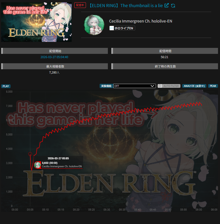>>110565159MAR 2026 EN BRONZE3/1 - IRyS - Black Mesa: 6,8623/2 - Calliope - Resident Evil Requiem: 9,6713/3 - Nimi - Resident Evil Requiem: 6,7693/4 - Only two talents qualified for the tally this day.3/5 - Raora - Pokemon Pokopia: 8,6923/6 - Only two talents qualified for the tally this day.3/7 - Only one talent qualified for the tally this day.3/8 - No talent qualified for the tally this day.3/9 - Only two talents qualified for the tally this day.3/10 - Calliope - Zatsu: 5,0553/11 - Gigi - Zatsu: 5,0283/12 - Bijou - Pokemon Pokopia: 9,3503/13 - Gigi - Future Games Show Watchalong: 8,9233/14 - Kiara - Arknights Enfield: 6,2723/15 - IRyS - Mario Tennis Fever: 9,7093/16 - Only two talents qualified for the tally this day.3/17 - Shiori - Resident Evil Requiem: 6,6693/18 - Mint - Karaoke plus Announcement: 6,2453/19 - Calliope - Karaoke plus Announcement: 8,6093/20 - IRyS - Resident Evil Requiem: 8,9603/21 - Kiara - Slay the Spire 2: 7,4133/22 - Nimi - Brush up plus karaoke: 9,4703/23 - Baelz - Yakuza 6: 5,0763/24 - Nimi - Poly Bridge 3: 7,2153/25 - Baelz - Archived Karaoke: 6,7133/26 - Nimi - Tomodachi Life Living the Dream: 7,394 PER COMPANY15x: Hololive English6x: N/A4x: Indie1x: Densetsu.EXEPER STREAMER4x: Nimi3x: IRyS, Calliope2x: Kiara, Gigi1x: Raora, Baelz, [Bijou, Shiori]