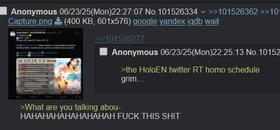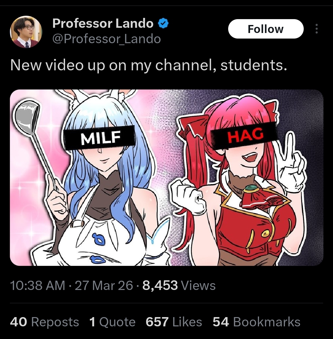 You know? been thinking lately about indies and Hololive, how indies think they are holier than thou and then proceed to harrass holos for not being part of their clan even tho they are the ''advocates'' for freedom and people doing what they want... unless they do what indies don't want... this came to mind thanks to the recent JJBA steel ball run shitshow due to Frieren's fans who started to downvote the shit out of JoJo because it was rated as best anime surpassing frieren with only 1 fucking episode, yes, the ones who watch an old elf learning about human empathy and compassion are rabid animals when they don't have their way...