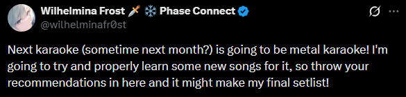 >Next karaoke (sometime next month?) is going to be metal karaoke!Wilhelmina post:https://x.com/wilhelminafr0st/status/2037766227058438417