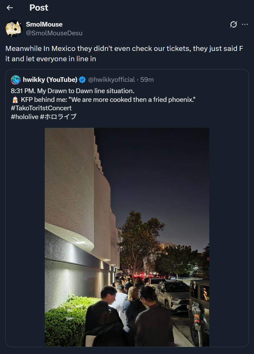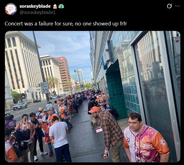 >>110599488Seeing the audience that attends irl stuff, it doesnt feel like they are stream watchers at all. Not saying thats bad or anything but I just cant imagine seeing some of these faces arguing with schizos from /here/.