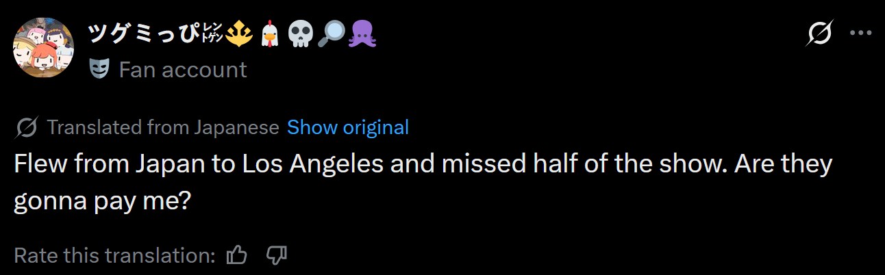 >>110604362these people should be given a refund from the venue and provided free spwn streaming tickets from cover