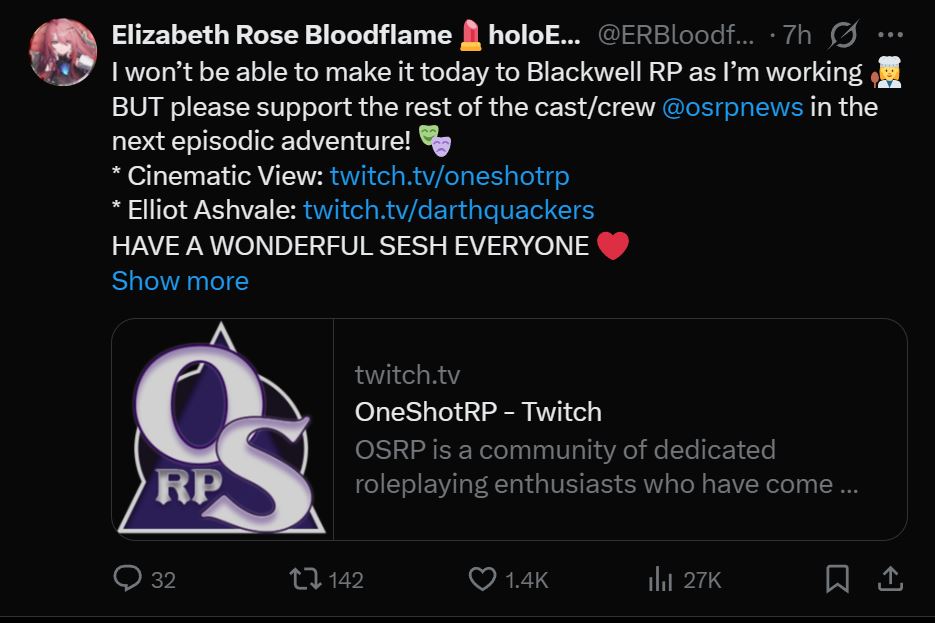 Can't wait for her management mandated 1 hour stream before she ghosts her fans and coworkers for another week straight