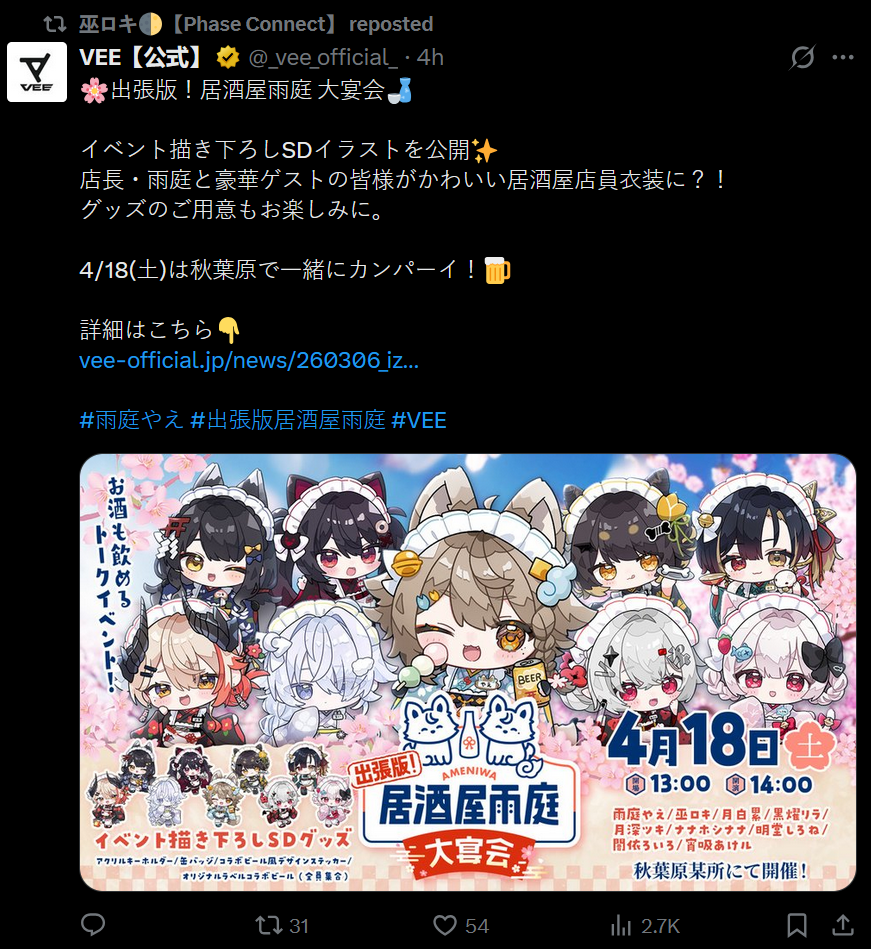 >>110607603offline event being held in Akihabara, izakaya pop-up maybe? Basically eat food and get drunk while getting to chat up vtubers. Get merch too, 4500 yen ticket.