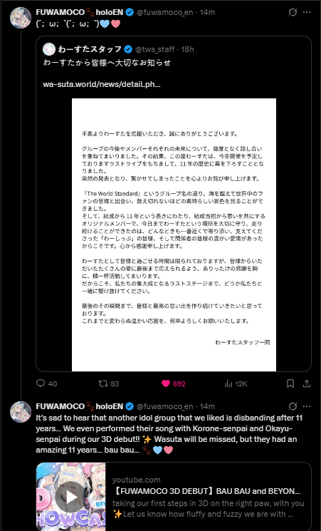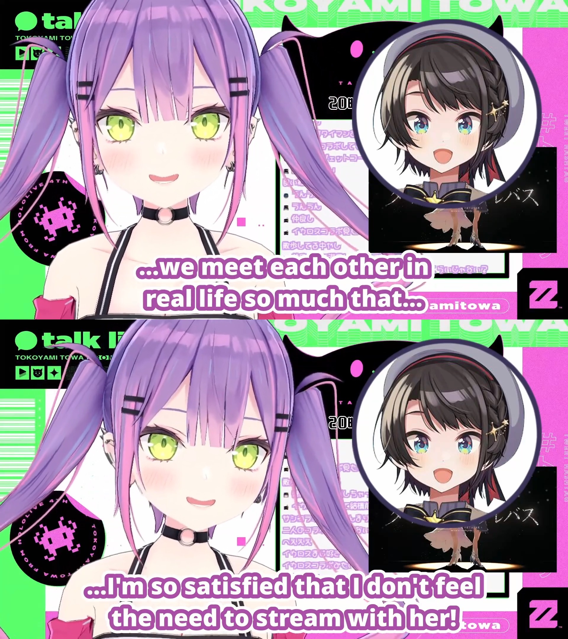 >>110604412Both Subaru and Towa talked extensively on what they did the whole weekend in New York.>>110604427Ok, fine. I looked it up again and they did one MC each the second day. I still think that one was live and i have seen plenty of pre-recorded 3D lives for over 5 years and a few actually live ones and you can tell kinda if you pay attention.Some anons are treating me like i'm a complete naive idiot who started watching hololive last month or something.
