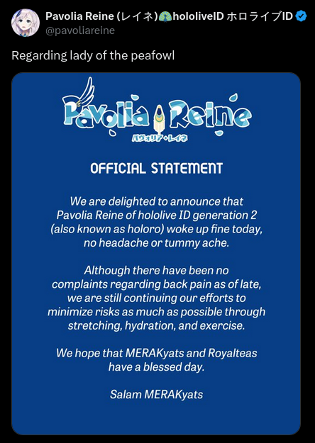 Last Stream:>#9【Ace Attorney Investigations 2】It's Been TOO LONG... (SPOILERS!)【Pavolia Reine/holoID gen 2】https://www.youtube.com/watch?v=rTbOHSBuExA>Original songs:Figure It Out: https://www.youtube.com/watch?v=NEtiag8nTUs Yummy Yum Yummy: https://www.youtube.com/watch?v=MUOHqI8Pb7Y Sip Some Tea: https://youtu.be/D1OOM67IsV4 Illusion Night: https://youtu.be/gREPKQUoD4o Love Me Love Me: https://youtu.be/MxwV963ZNEU あの青空のせいだ (Ano Aozora no Sei da): https://youtu.be/dzUfNQaaemk Gate Open: START!: https://youtu.be/VFpOBazE3rs >Cover songs:Sweetest Scarlet: https://www.youtube.com/watch?v=EWh2FPu9FLgSoiree: https://www.youtube.com/watch?v=IVQ_KZNpuhQFire Dance: https://www.youtube.com/watch?v=RUd3Sf2Fzi0 ハオ (HAO) :https://www.youtube.com/watch?v=VAffx0WO9do Invincible Rainbow Arrow: https://youtu.be/JHp-EB2jFn0 Mass Destruction: https://www.youtube.com/watch?v=Cs33S-Z6H14 Fatale: https://www.youtube.com/watch?v=dzcIlty1GB0 Salamander: https://youtu.be/U9o4BOeBcJU Beyond the Way: https://youtu.be/QD3vEctbWGg KICK BACK: https://youtu.be/7wG3rtD1GP4 -Star Divine- finale: https://youtu.be/75gnquXjQSE Overdose: https://youtu.be/LdrwHNtz3Zg Hanamaru Pippi wa Yoiko Dake: https://youtu.be/e2c08JOSGwI Ai Kotoba IV: https://youtu.be/Ina1fe-sssg RAD DOGS: https://youtu.be/D8yBNjhgQ0Q Cynical Night Plan: https://youtu.be/nWP8Wmho188 Beat Eater: https://youtu.be/nbB3KsFRv4U シンデレラ (Cinderella): https://youtu.be/o6C7-azdU7I Envy Baby: https://youtu.be/4F9jLdTTuT0 革命デュアリズム (Kakumei Dualism) Side A: https://youtu.be/Dx-_i0RWwNc 愛Dee: https://youtu.be/o_xMgw2j9v8 うっせぇわ (USSEEWA): https://youtu.be/dYvQcVG_dVg KING: https://youtu.be/LfI8sxSFtuE >Original songs Reine is in:Show Them (Who You Are): https://www.youtube.com/watch?v=s8oZMcLCiCUJuara Khatulistiwa :https://www.youtube.com/watch?v=u7oCq65-S5w Senandung Jiwa: https://youtu.be/4tkdCIhhuuc HI:STREET TIME: https://www.youtube.com/watch?v=0Jvss8cjpec Slap by Step: https://youtu.be/cZ4Yex_x6ZQ Bokura ga kuru kara: https://youtu.be/LpRMpVxJ2nE HOLOTORI Dance!: https://youtu.be/BcO9bZavHRg AventureHolic: https://youtu.be/oLp3GDZcBCc Janji: https://www.youtube.com/watch?v=Ce87eFO2XE4 id:entity voices: https://youtu.be/Wp90CrP-s_8 >Covers Reine is in:D/NA : https://www.youtube.com/watch?v=0e9cWmW5XfEIllusion Night/ 飯田ぽち。duet https://youtu.be/Vsj0KiQPmDI 輪舞-Revolution https://youtu.be/n84pjiyK72U Mogyutto "love" de Sekkin Chuu!: https://www.youtube.com/watch?v=zgnrkxQOEGg Hampa Hatiku: https://www.youtube.com/watch?v=-n4UgB4GdTE Mermaid Festa vol.1: https://www.youtube.com/watch?v=PSjn-HmkcKc Indonesian Folk Music Medley 2024 ver: https://www.youtube.com/watch?v=rjhIMMSolmc PLAYBOY: https://www.youtube.com/watch?v=gT_KADLkNew OTONABLUE: https://youtu.be/rLIz-w5cyeU Kawaikutegomen: https://youtu.be/-abAMimXVOc Terhebat: https://www.youtube.com/watch?v=PaOMF-g1ZWU Angelic Angel: https://youtu.be/mYYmMht45hg 気分上々: https://youtu.be/s_HsEltY_O0 Bad End Night: https://youtu.be/wFTSE4h4SSs Bebas: https://www.youtube.com/watch?v=wlyRGXUwjVA ECHO: https://youtu.be/tn9us3WeFgI Animal: https://youtu.be/KNBdITatp8Y The Baddest: https://youtu.be/8Jz0hUbu1mw Fly Me to the Star: https://youtu.be/s0p7jwJKkzs Indonesian Folk Music Medley: https://www.youtube.com/watch?v=lFQW5S_xH1o 革命デュアリズム (Kakumei Dualism) Side B: https://youtu.be/euBur-z_lmk 可愛くなりたい (Kawaiku Naritai): https://youtu.be/Hya6rBRCd6Y Ochame Kinou: https://youtu.be/eJjz3owWnbU https://www.youtube.com/@PavoliaReinehttps://twitter.com/pavoliareinePrevious thread: >>110531678