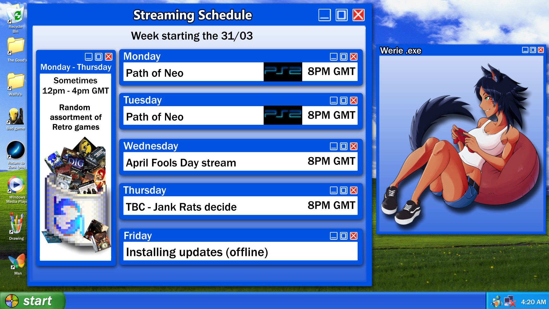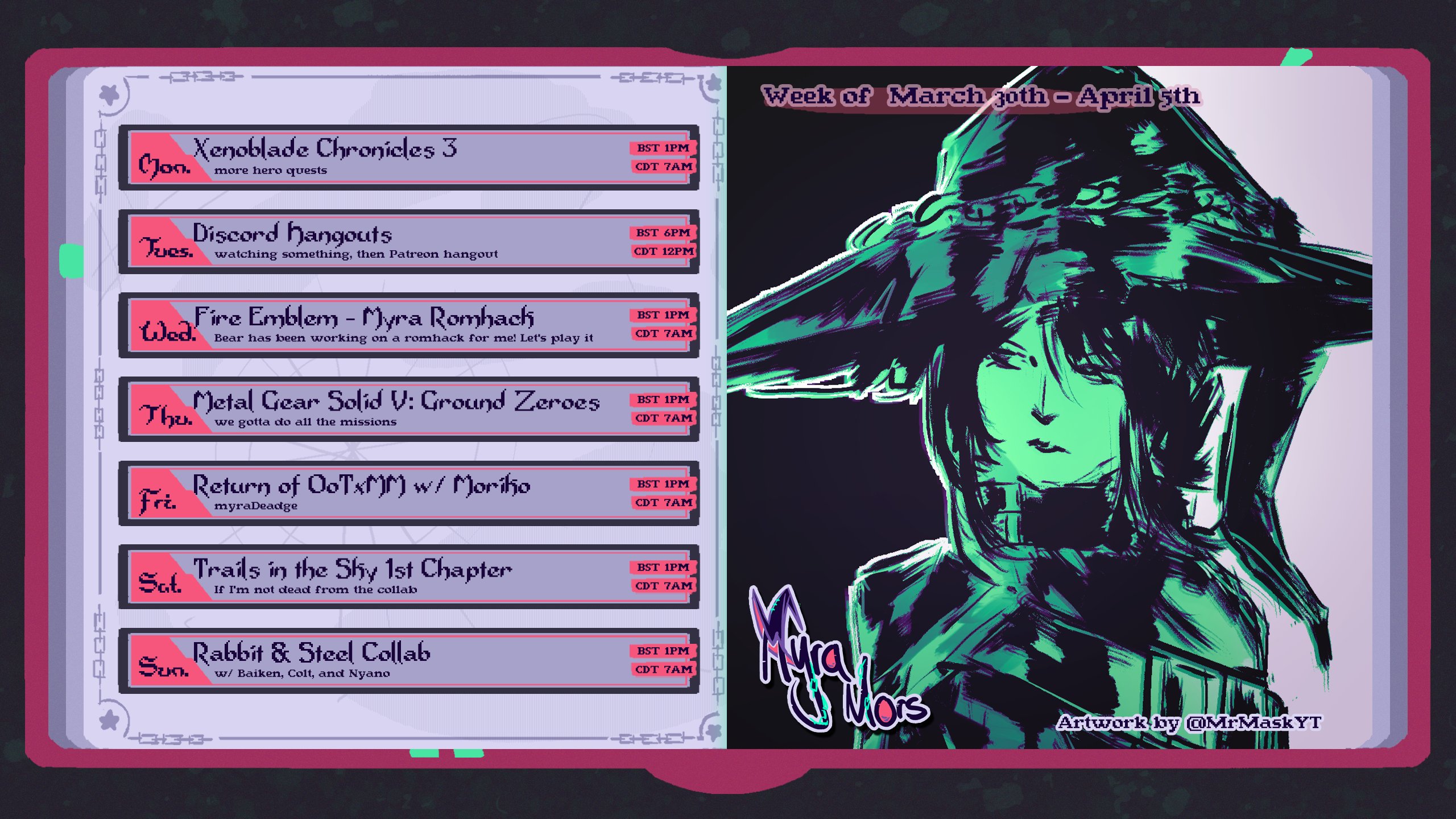 >>110632869Ongoing streamsCorpse is playing Morrowind mod Tamriel Rebuilthttps://www.twitch.tv/corpse_chElisia is playing Mega Man Battle Network 2https://www.twitch.tv/elisiavtRiona is playing Resident Evil 2 randomizedhttps://www.twitch.tv/retrorionaKyubalt is playing King's Field 2https://www.twitch.tv/kyubaltFrosty is playing Spyro 2https://www.twitch.tv/frostbytevtMahou Sunny is playing Devil May Cry 1https://www.twitch.tv/mahousunnyHank Hill is streaminghttps://www.twitch.tv/thegoodjaredMineko is playing Half-Life 1https://www.twitch.tv/mineko_3_catAki GouGou is playing Pikmin 2https://www.twitch.tv/akkigouRial Miruku is streaminghttps://www.twitch.tv/rialtimeFuwa Hanekaze is playing Mega Man X7https://www.youtube.com/watch?v=hnVnHPDGmdwMitora is playing Super Deformed Super Iron Ball Fighthttps://www.youtube.com/watch?v=bLbr-abUljUMimiko Tomomo is playing River Master Fishing 2 for the SFChttps://www.youtube.com/watch?v=x3v3p4UiL64Minakami Kuon is playing Torneko's Great Adventure 2https://www.youtube.com/watch?v=MZQvBA7QPf0Techibi is playing Lupin the 3rd on Famicomhttps://www.youtube.com/watch?v=rNJ3OZ5Ir9ISarara is playing Shin Megami Tensei 3 Nocturnehttps://www.youtube.com/watch?v=W8DiNm9Ce6s