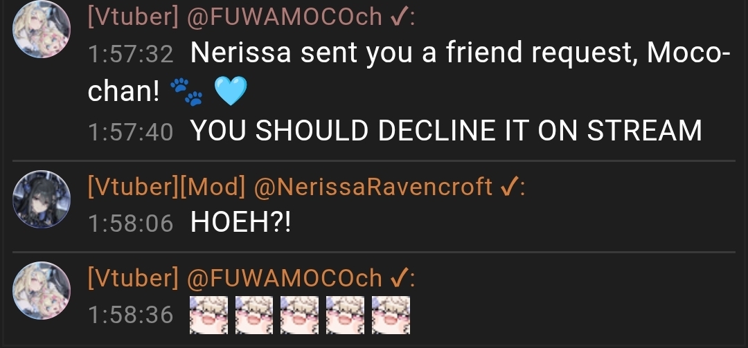>Fuwawa said Mococo should decline Nerissa's friend request