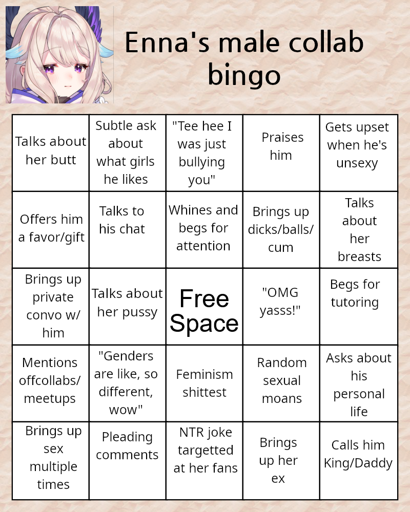 Has Enna ever done a 1v1 collab with a male coworker that wasn't a 3 hour bratty-flirting session? What I'm asking is, can she even interact with the opposite sex without flirting with them?