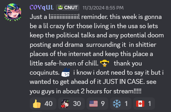 I'm surprised Coqui has "fans" that are actually conservative and not more left-leaning like she is. There's literally nothing about her that seems to be meant to appeal to right-wingers and the obsessed antis are weird. Actually that might apply to all of 3am for anyone that has listened to their opinions on things during yap streams.