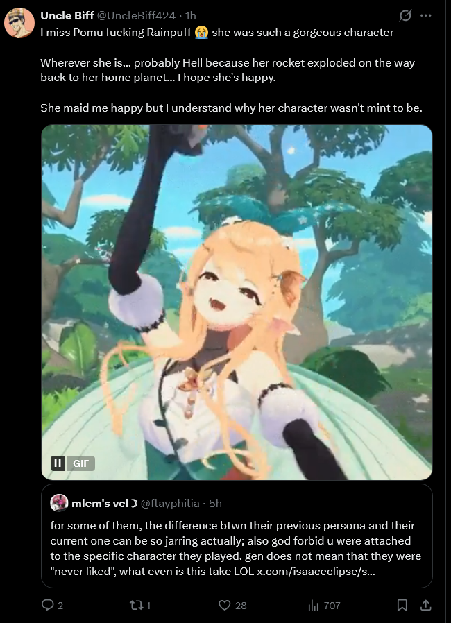 >>110707135Definitely. I agree that she was feeling really insecure and lonely for a while, and the vshojo stuff crushed her because it was her attempt at fixing that, but in the end, after getting more regular collab partners and now Densetsu being a reality I think nowadays she seems to be in a much better place.Back then she was under a lot of stress from her other job and other life issues, and she seemed to channel that pent up rage into creative vtubing stuff, but I doubt it was healthy for her.