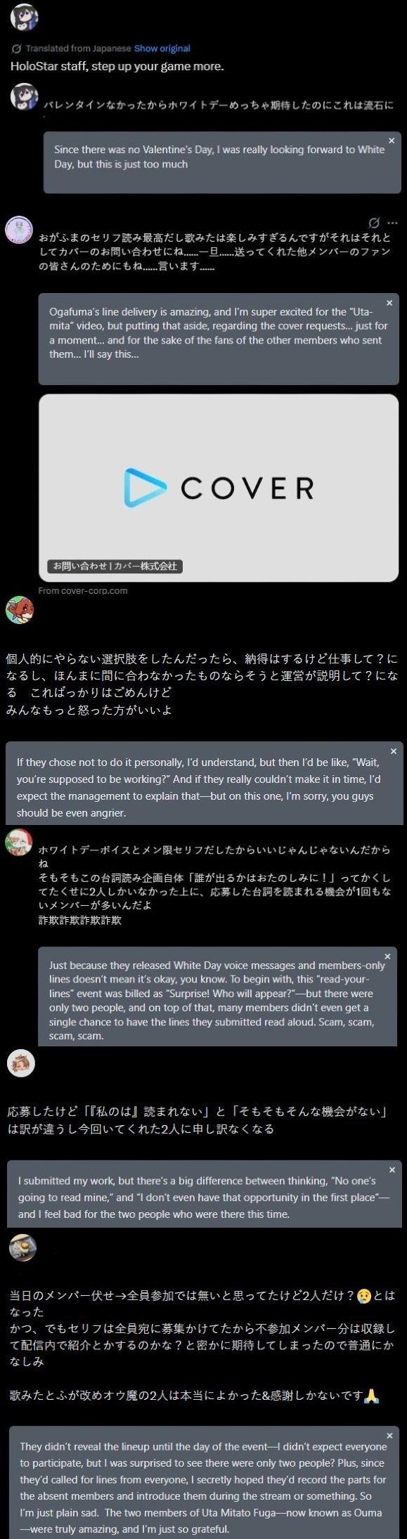 Furthermore, our corporate website's "Report Offensive or Defamatory Behavior" form (anycolor.co.jp/report) accepts reports of defamation against our affiliated live streamers, as well as reports of unauthorized reproduction of cover videos, short videos, live event footage, etc., and impersonation. We express our sincere gratitude to everyone who has cooperated with us on a daily basis, and we kindly ask for your continued cooperation.