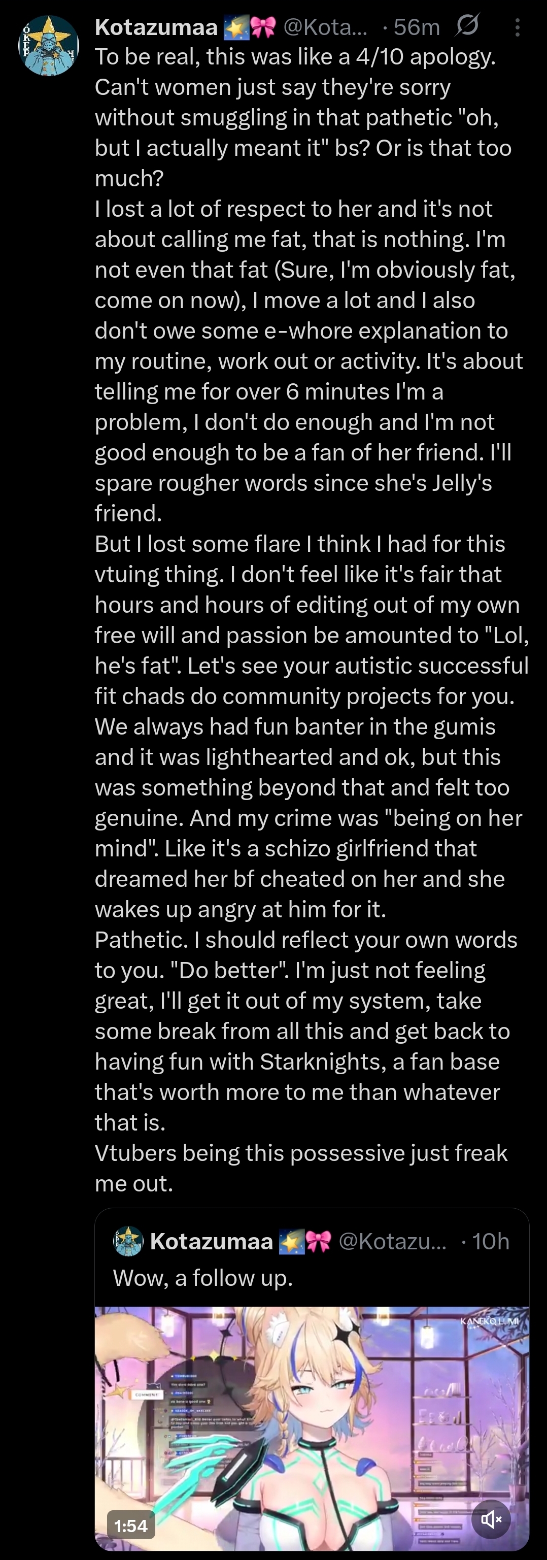 >>110689297As usual, about as obvious as that not so subtle shiposting that happened when Advent clobbered 7 Phase girls with a song they ran off the rip against a full blown MV that Phase put out. They'll never live that down no matter how much Hololive shitposting they do. And the best part, like beggars, its because they don't even want to watch their supposed oshis. Double own.