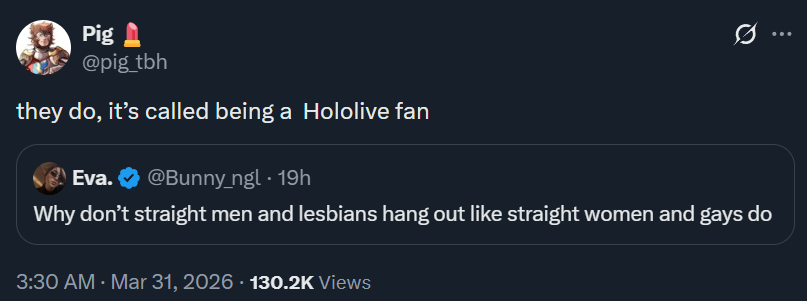 You guys ever consider becoming male vtubers? If I was actually streaming to fujos and not gay men or trans women I’d have really considered it. I wouldn’t mind doing BFE and I’ve seen a lot of the stars faces: I’m certainly more attractive than them. Not gonna do it now, I don’t think it’s worth it, but the idea of women schlicking it to me doing asmr isn’t exactly unappealing ya know?