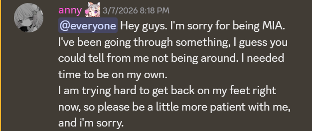 >>110709919This is the last I've heard from her other than the occasional fanart retweet