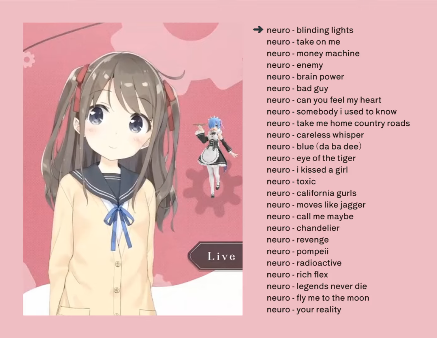>Who is Neuro-sama?Neuro-sama is a neural network created by Vedal in 2018 for the purpose of learning to play osu! In December 2022 Vedal revived the project with the addition of a large language model, a TTS software and a Live2D model, which allow Neuro-sama to interact with her chat as a VTuber. Since then, she has been entertaining the chat with responses and unhinged rants nearly daily, as well as learning new skills such as singing, playing other games, and collaborating with other VTubers. Join /swarm/ today and welcome our new AI overlord!>ScheduleTuesday: NeuroWednesday: Evil's BirthdayThursday: EvilSaturday: Hollowknight w/ Evil + Vedal>LinksTwitch: https://www.twitch.tv/vedal987YouTube:https://www.youtube.com/@Neurosamahttps://www.youtube.com/@OfficialNeurosamaClipsTikTok: https://www.tiktok.com/@neurosamaaiX:https://x.com/NeurosamaAIhttps://x.com/EvilNeuroAIThese and other official links: https://vedal.ai>Music & ClipsColorful Array - Neuro-sama (Official Video) - https://www.youtube.com/watch?v=FNfGw1wrKtUNEVER - Neuro x Evil (Official Video) - https://www.youtube.com/watch?v=CKCgoEGiUEgBOOM - Evil (Official Video) - https://www.youtube.com/watch?v=8Nt9YPnYyjsLIFE - Neuro-sama (Official Video) - https://www.youtube.com/watch?v=MDc1mjrIsPMhttps://neurokaraoke.comhttps://rentry.org/neuro-musichttps://rentry.org/neuro-videos>EducationalInterested in AI but don't understand it? Watch these:https://www.youtube.com/watch?v=WXuK6gekU1Yhttps://www.youtube.com/watch?v=d95J8yzvjbQHow does she know what to say? Watch this: https://www.youtube.com/watch?v=wjZofJX0v4MWant to learn more about AI? Read these: https://files.catbox.moe/kximv6.pngWant to (seriously) learn AI? Read these: https://files.catbox.moe/ajl3nx.png>MiscGame Integration: https://github.com/VedalAI/neuro-game-sdk/LoRA: https://rentry.org/neuro-lora-v2Searchable VOD Transcripts: https://libraryofladev.com/VODs: https://www.youtube.com/@Neuro-samaUnofficialVODs>Merchhttps://neurosama.shop/>Previous thread>>110697387