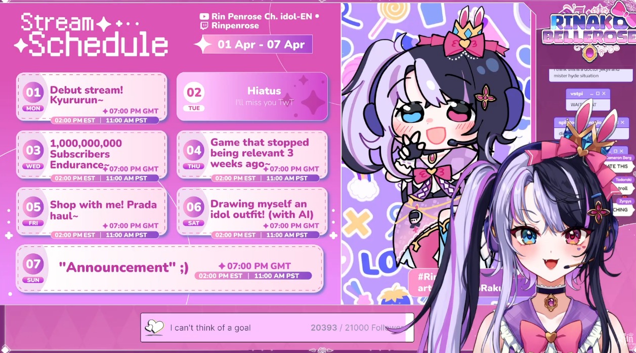 STREAMSRiki, unarchived karaokehttps://www.twitch.tv/rikipoppetvthttps://www.youtube.com/watch?v=o83oXTNEstgTaiga, collabhttps://www.twitch.tv/taigatoragamiTonya, collab with Enyahttps://www.youtube.com/watch?v=PUHv8H1CxS4Enya, collab with Tonyahttps://www.twitch.tv/enyaignis