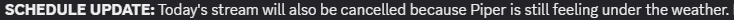 just in case you're also wondering where piper's stream is, she's not feeling well today