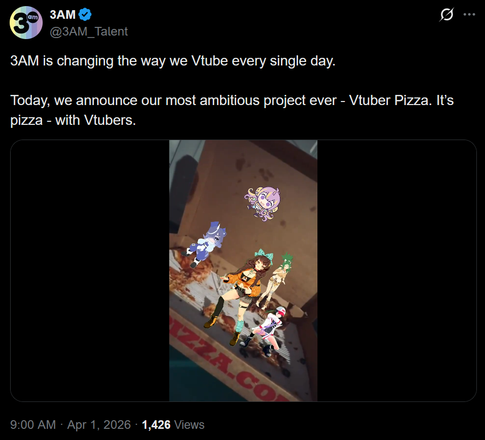 3AM selling augmented reality pizzashttps://x.com/3AM_Talent/status/2039326920370790511https://merch.kawaentertainment.com/collections/3am