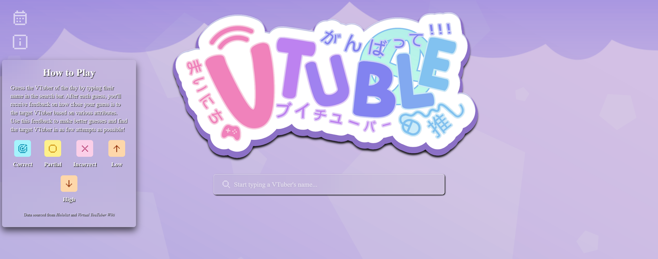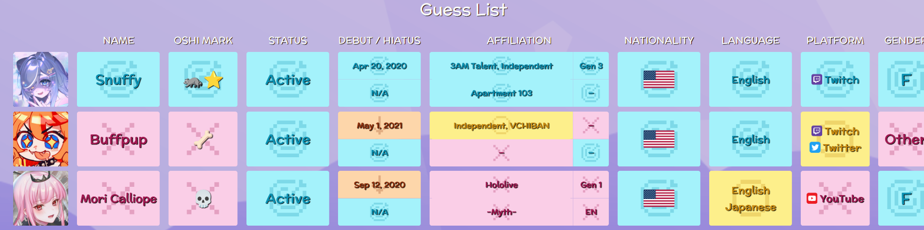 Someone released a "dailies" game where you have to guess the VTuber of the day based on the attributes of the VTubers you enterhttps://www.vtuble.moe/