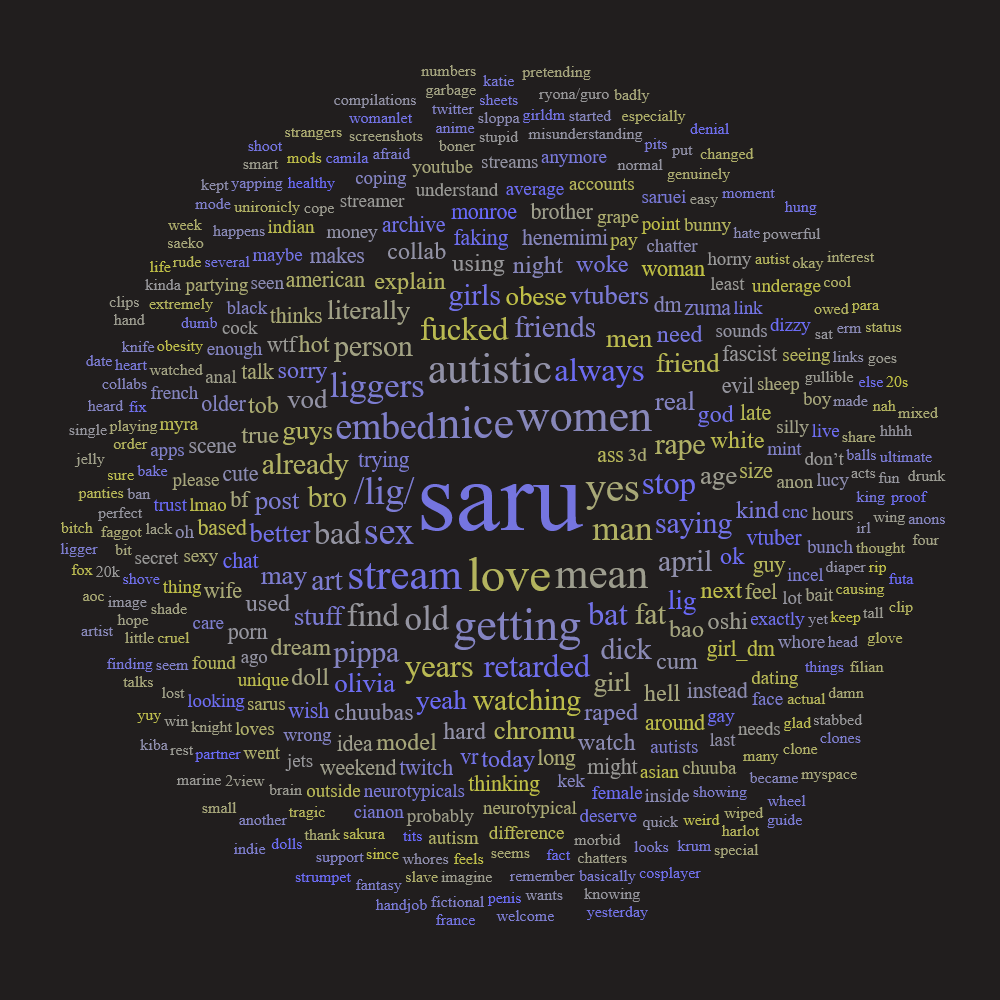>>110778718>sites like this exist for years an nobody had any problem with it>vtuber schizos enter the scene and start using them to stalk and harass people>twitch has to shut it all down