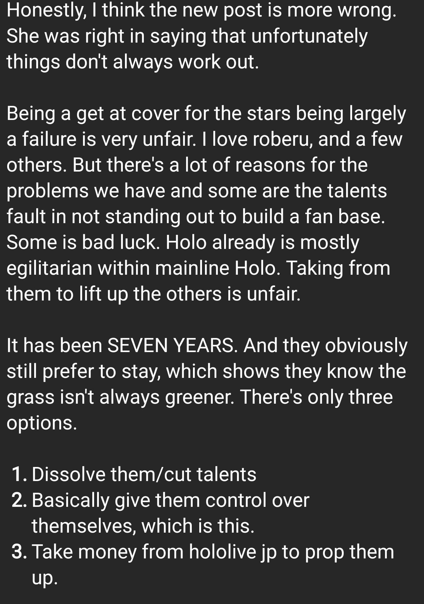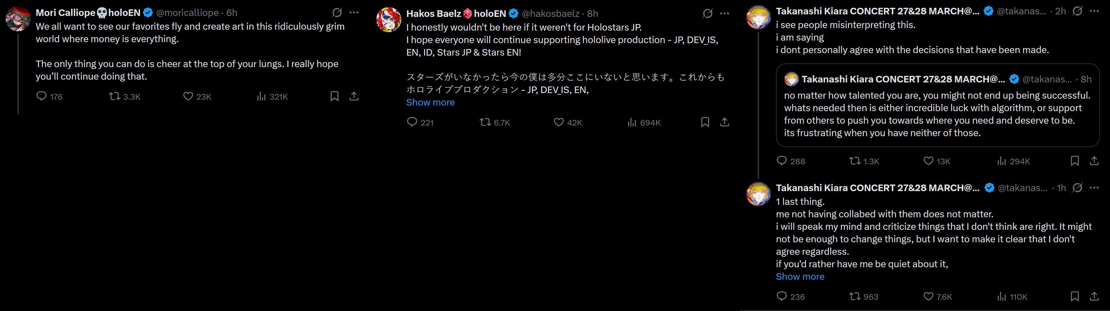 I'm not defending Kiara. The fact she said anything at all and caused drama for herself was retarded.I'll say this though, as a few pointed out Kiara probably feels a certain way because this happened to her before (or something similar) so she would disagree with what they are doing.She forgot that this is a business.I lied, she KNOWS it's a business but she just hates when It happens.yeah, Kiara makes cover money and got a duo live which sold out but >"when that stops, or the branch becomes less profitable, will this happen to us too? Will I have to go through this again?"is what she's thinking about. I doubt she cares about Dubais whatsoever but using them as a way to portray her hate towards the isolation/sink or swim method.do I agree with it? not really but I see where Kiara is coming from.