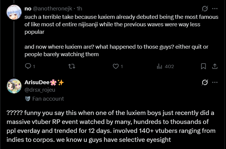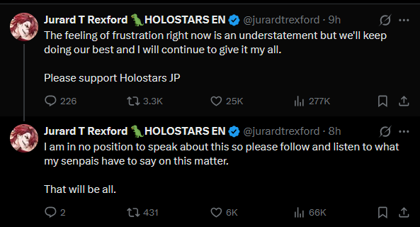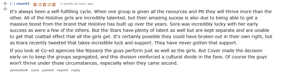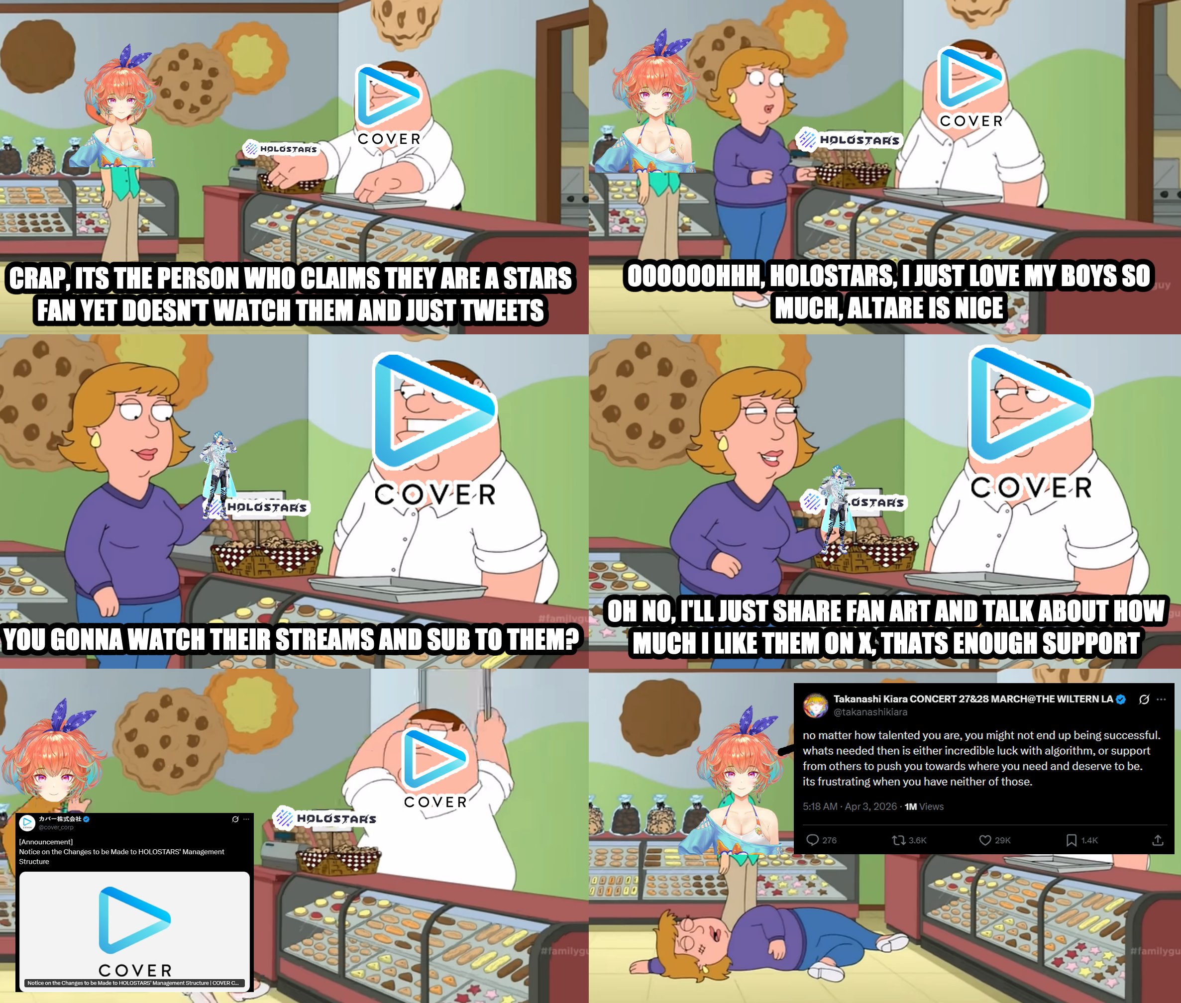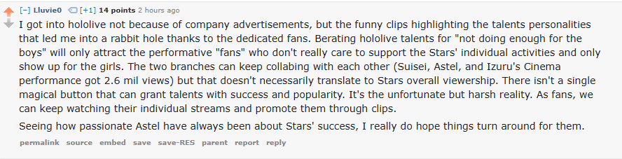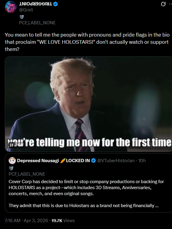 Hello, the Bolivian guy that draws porn of Stars x Live here, I noticed some dude kept spamming my art here passing off as me which cool, thanks for the publicity.Usually I only post on /v/ or /pw/ and sometimes /sp/ depending on the game day.I just wanna say I am actually more surprised at the amount of "fans" who are shocked this shit is happening than the announcement itself and am laughing, I been watching Altare and other talents for a while and they has been making comments about this on his streams all the time, which these "fans" would know if they watched, hell the Unicorns that hate the branch seemed to tune in more than these people and the sad part is its so fucking easy to support a VTuber even if you are poor.The can blame the company or the girls who don't want to collab with them all they want but that won't change shit, Kiara could collab with the entire branch now and tomorrow nothing would change for stars, because their fans think sharing shitty tumblr tier fan art on x is enough.Anyways, sad if they die but the branch had it coming, I am used to disappointment so I'll just move one to something else once they are gone.