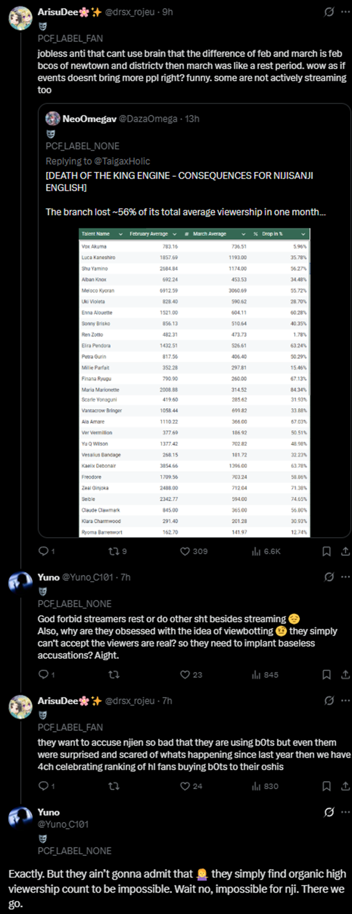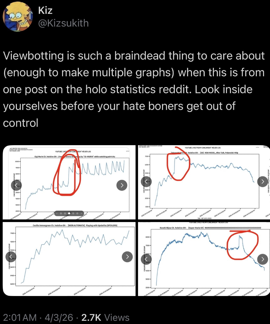 >>110780964>Sales of birthday>Anniversary goodsIf this is real, these are the two factors that we should discuss, because this proves that Holostars have absurdly low merch sale, and this includes Roberu and Oga.>But why?There was some retards botting their streams with a rather high frequency, giving the idea that their male and female collabs are pulling numbers for these two, OBVIOUSLY fake, and I patiently just wait for information that can prove otherwise, like this one.Other than this, it's either Indonesia or Flipland fucking itself with floods or quakes, since these two are the main nations hosting massive bot farms since their country is composed of 100% politician corruption, and you can freely do crimes there as long as you pay in advance.