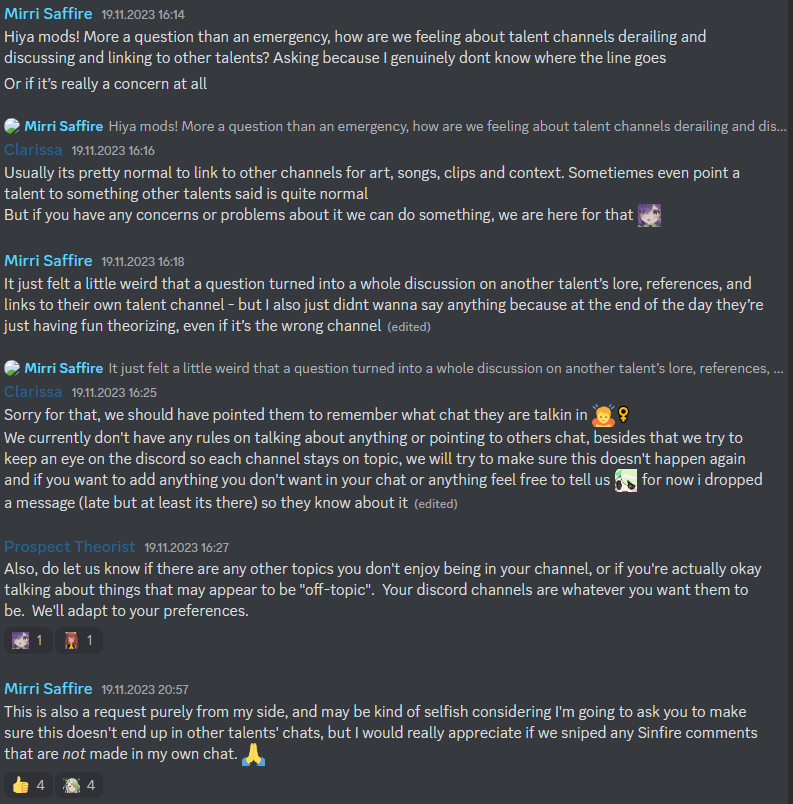 I modded for EIEN because I liked some of their talents at the time and had moderation experience in a commercial context. Team was full of attention seeking 3rd world retards. The personalities of many there were exactly as you imagine them, quick to reply to talents they like, otherwise virtually absent. Borderline catty. Procedures were all over the place. No central knowledge base, not even an attempt at one, had to make my own from 3 power point presentations, 27 channels and threads and the talent's message history. Talents had a channel to sick us on people or bring up moderation topics. Picrel, Mirri being insecure about everything, as always.