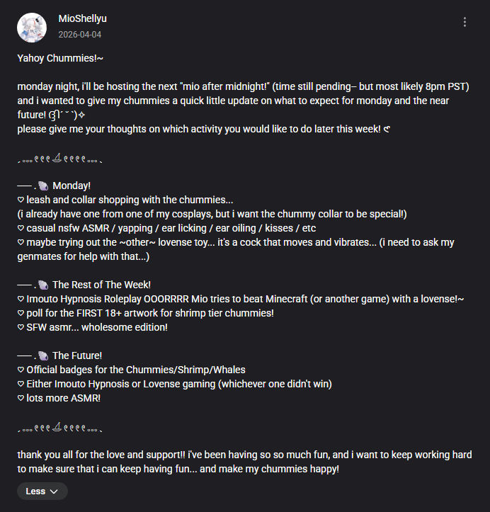 Mio seems very confused about what she wants. Her job is to be lewd, she wants (has) to be seiso on youtube but she keeps bringing up rplay shit on youtube which is annoying since it derails the game streams and youtube censors a lot of words. As much as I want to test the limits of her cunt I really want to talk to Mio to help ground herself and stop flip flopping every 10 seconds but her paypigs seem content with buying her foot long dildos.